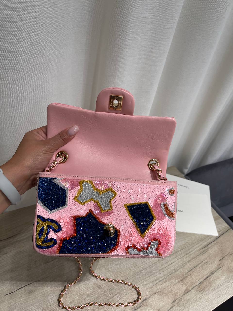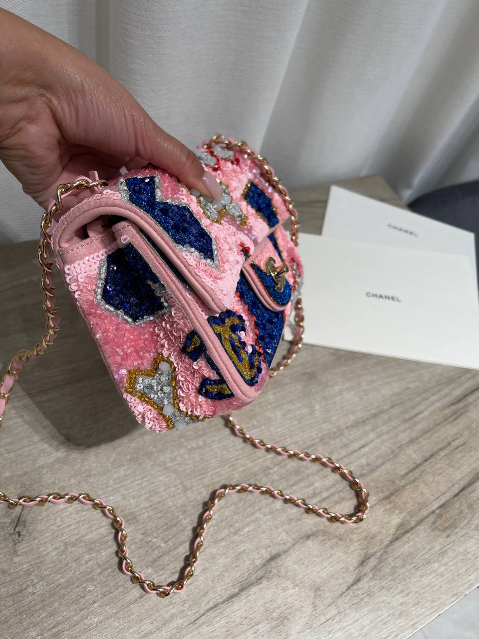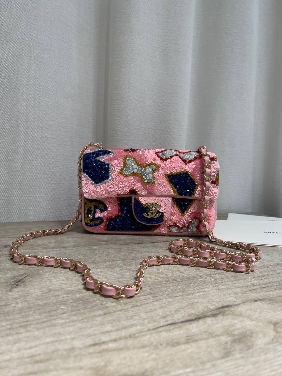 Эта женская сумка от Chanel – воплощение элегантности и изысканности. Сумка LUX-124380, украшенная пайетками, станет ярким акцентом в вашем образе, подчеркивая ваш безупречный вкус.