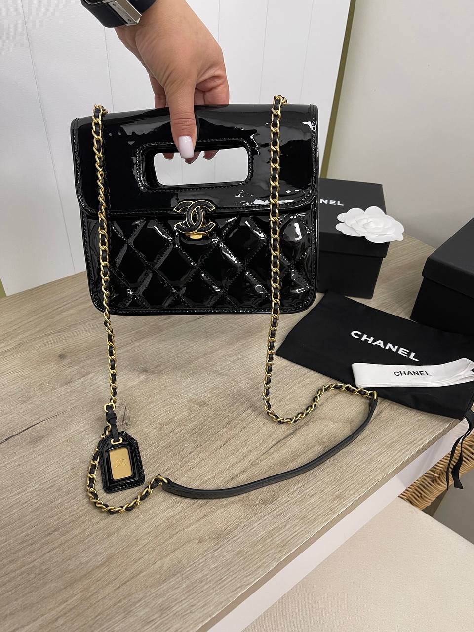 Сумка женская Chanel LUX-89414 выполнена в элегантном стиле. Черный лакированный материал с ромбовидным узором придает сумке изысканный вид. Цепочка золотистого цвета служит одновременно ручкой и плечевым ремнем, обеспечивая комфорт и практичность.