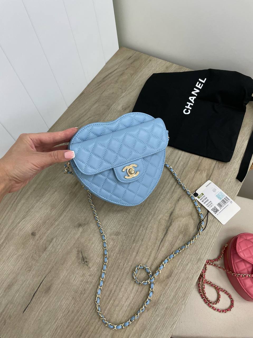 Сумка женская Chanel LUX-69865 представляет собой стильный аксессуар в форме сердца, выполненный в небесно-голубом цвете. Сумка имеет стеганую текстуру, золотистую фурнитуру и цепочку для ношения через плечо. Она идеально подойдет для создания романтического или элегантного образа.