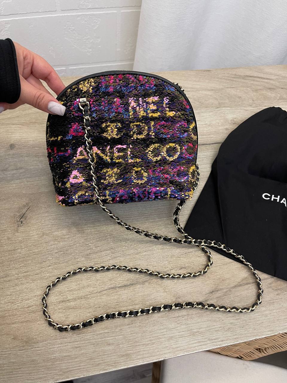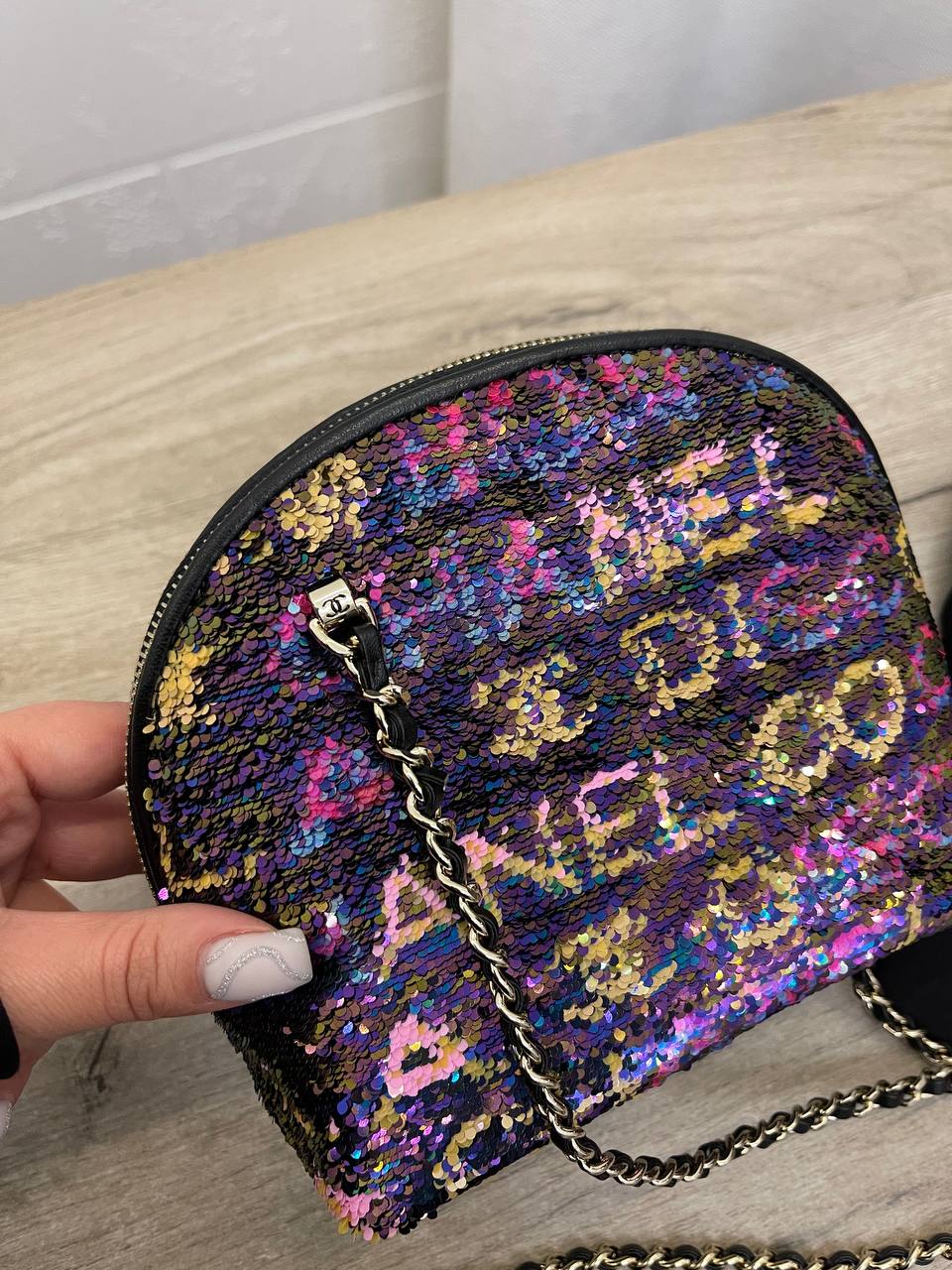 Сумка женская Chanel LUX-100923 - это элегантный аксессуар, выполненный в фирменном стиле модного дома Chanel. Сумка имеет круглую форму и украшена разноцветными пайетками. Она станет прекрасным дополнением к любому образу, добавляя ему изысканности и шарма.