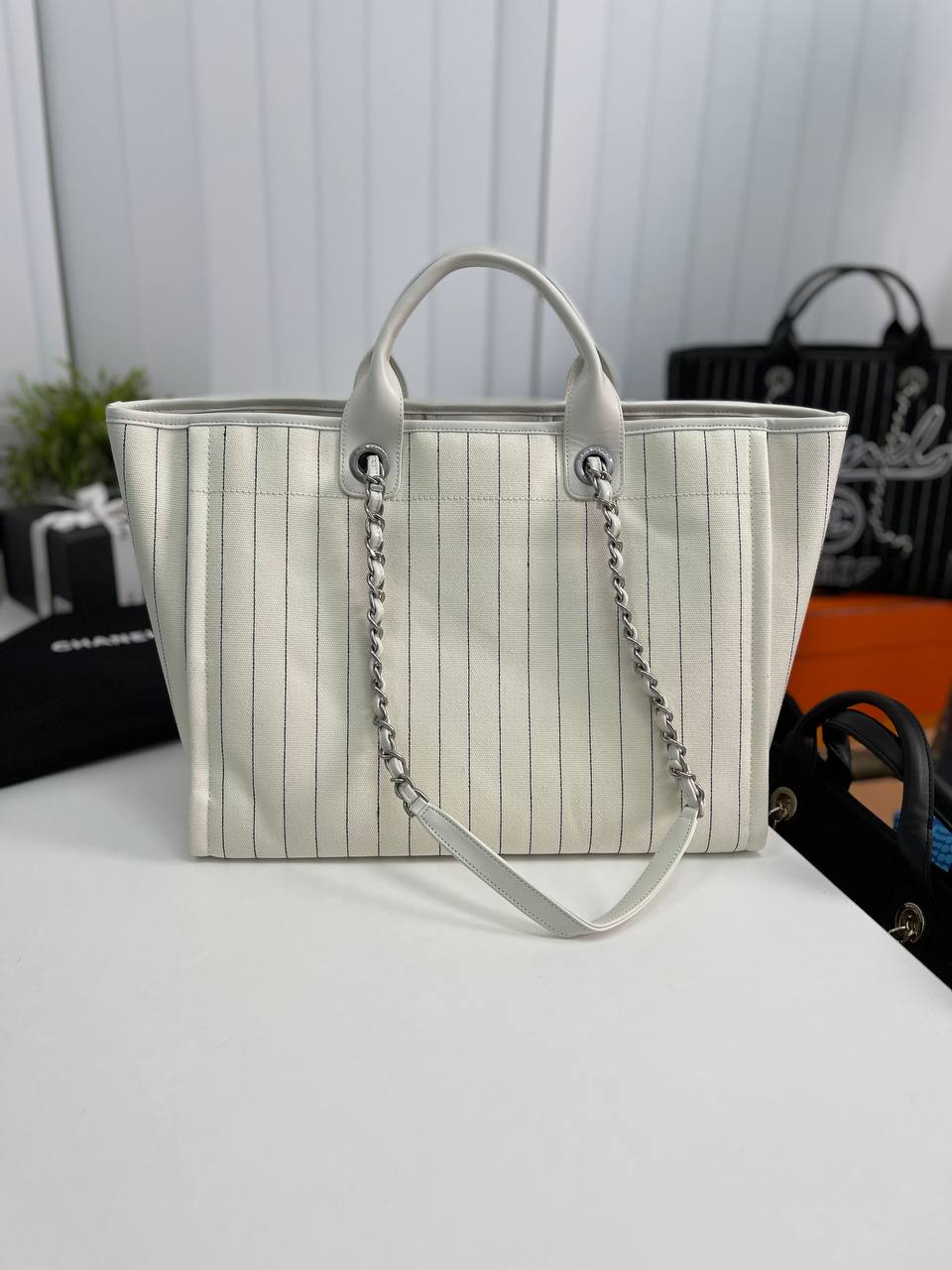 Сумка женская Chanel LUX-89418 выполнена в повседневном стиле. Сумка белого цвета с чёрными полосками и надписью Chanel. Отлично подойдёт для повседневного использования, дополняя ваш образ.
