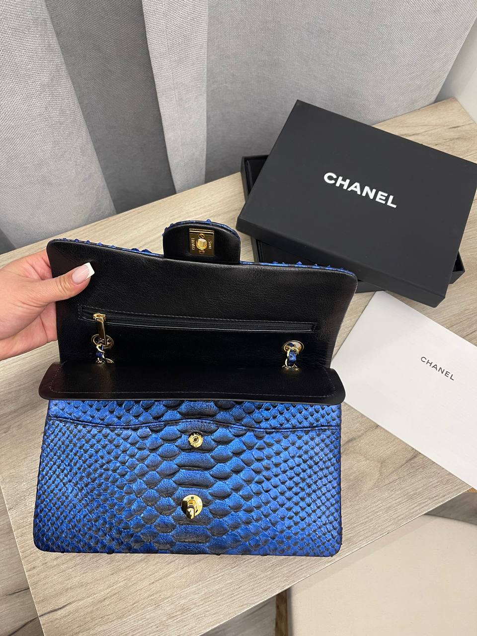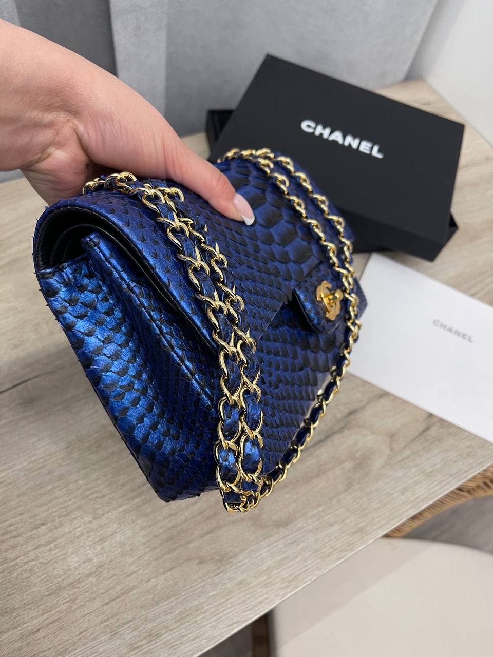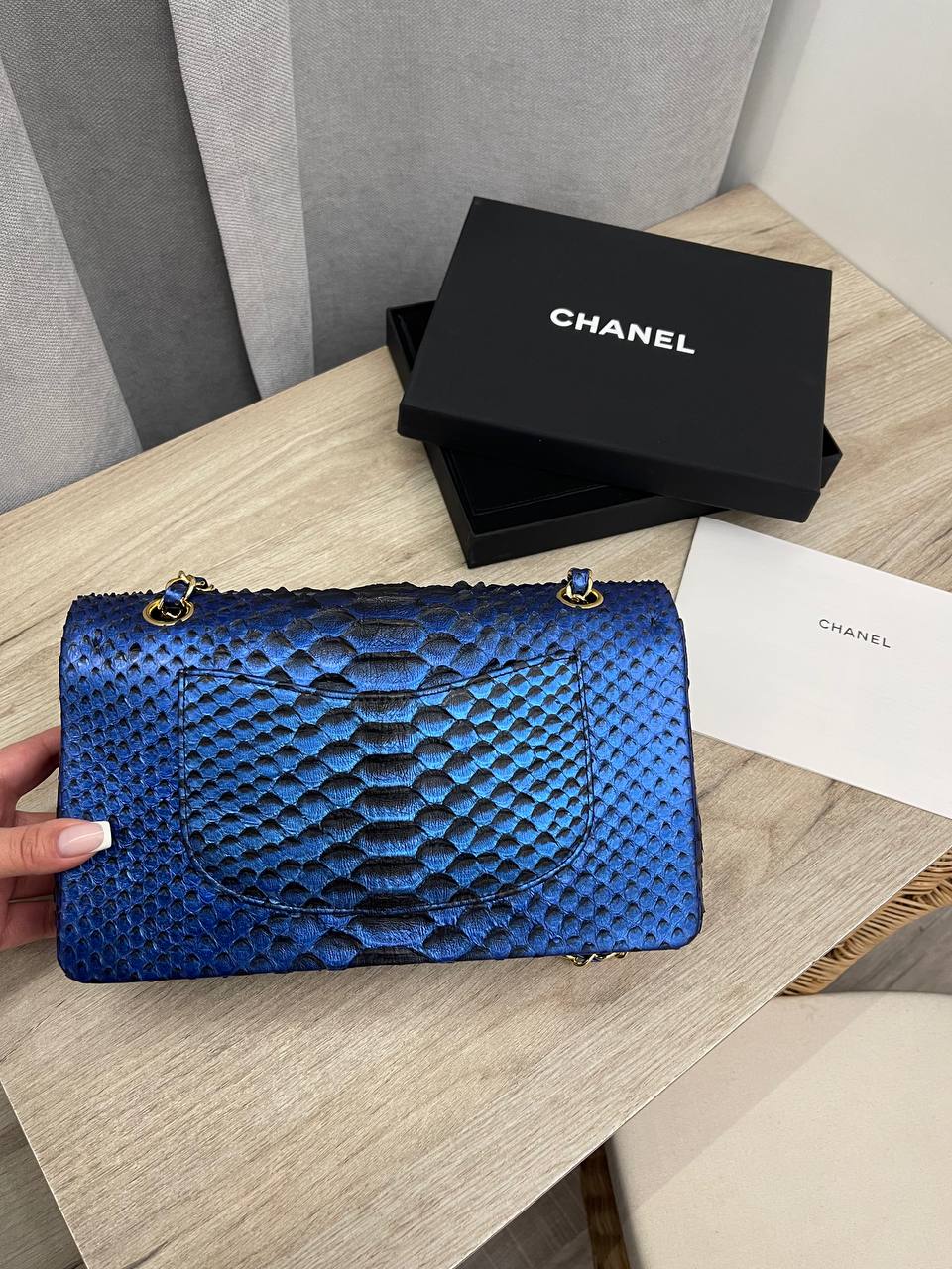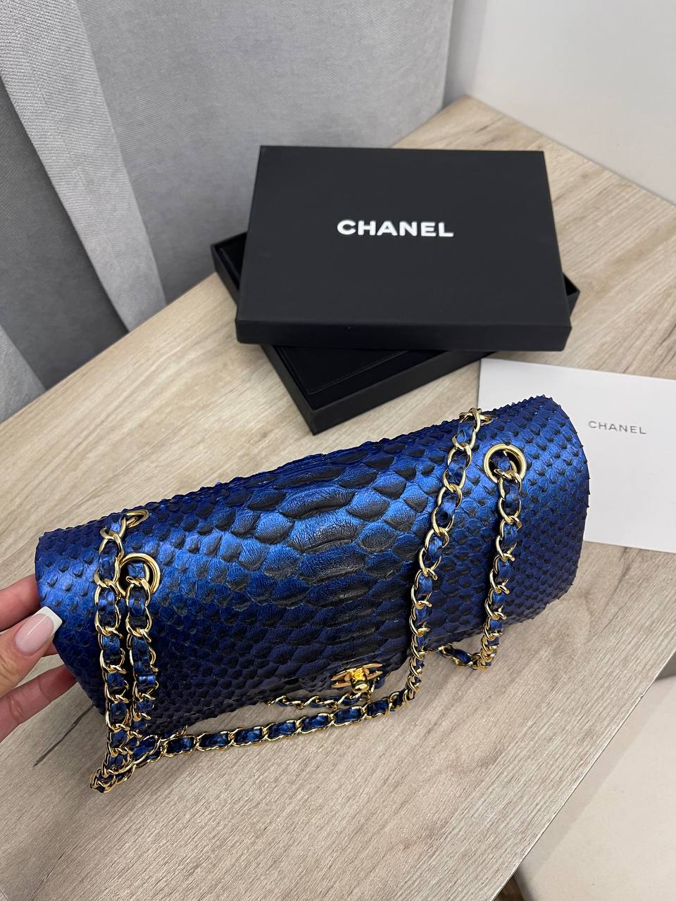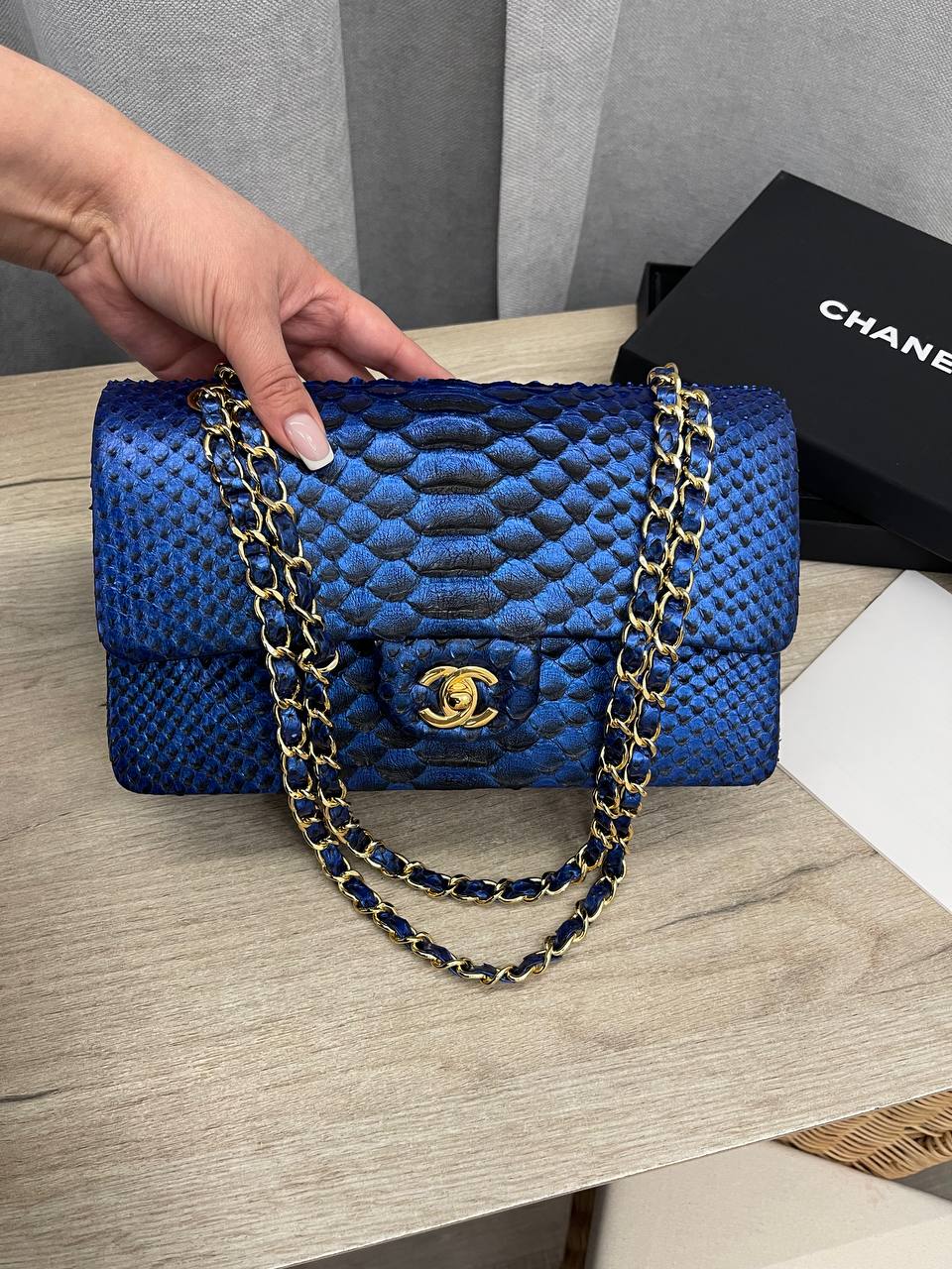 Женская сумка Chanel LUX-101571 — это воплощение изысканности и стиля. Сумка выполнена в синем цвете, имеет уникальную текстуру, напоминающую кожу змеи. Такая сумка станет прекрасным дополнением к любому образу, подчеркивая индивидуальность и вкус своей обладательницы.