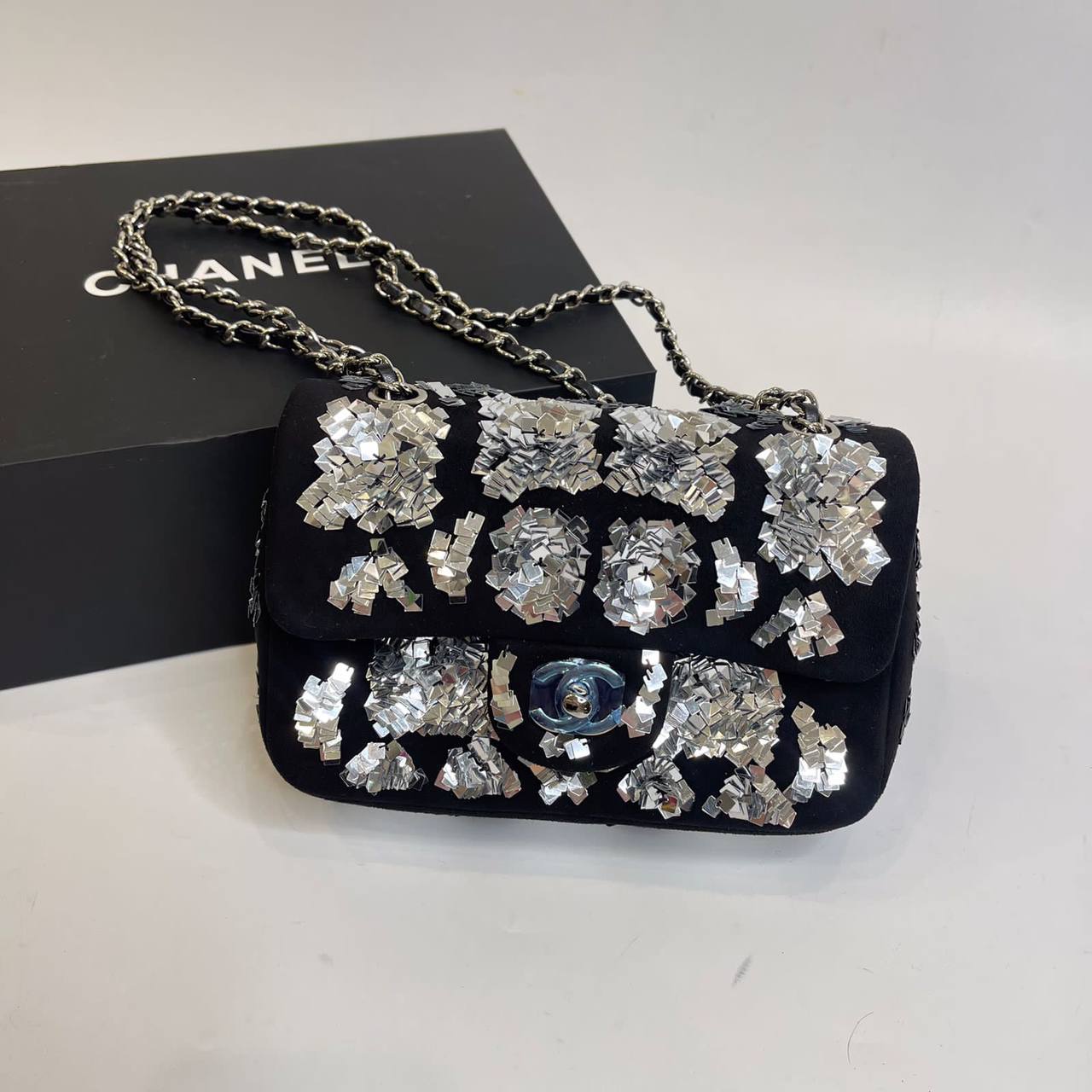 Эта женская сумка Chanel LUX-67687 выполнена в элегантном и роскошном стиле. Черный цвет основы сумки контрастирует с серебристыми пайетками, создавая эффект мерцания и привлекая внимание. Сумка идеально подходит для вечерних выходов, торжественных мероприятий или как акцентный аксессуар к модному образу.