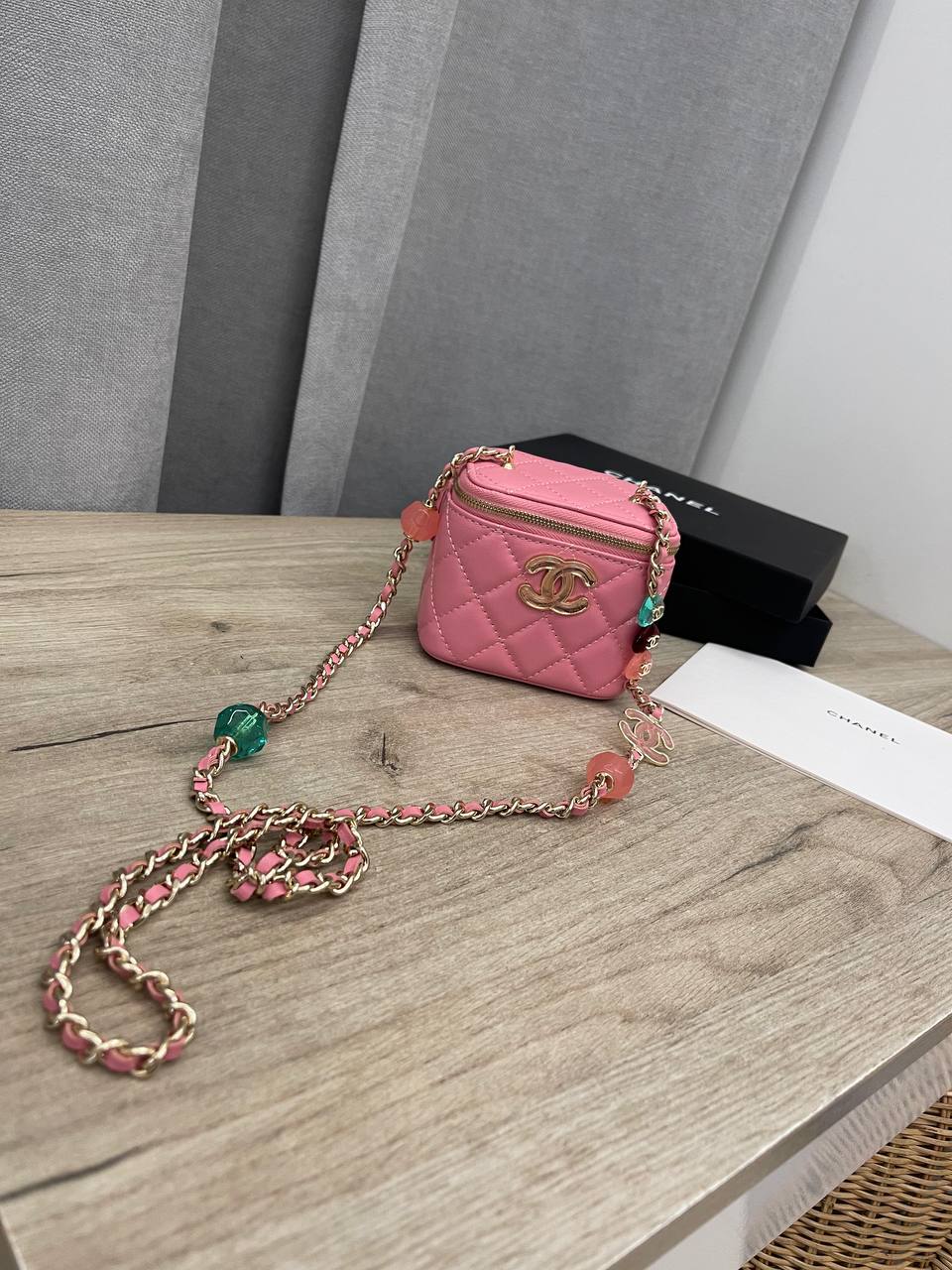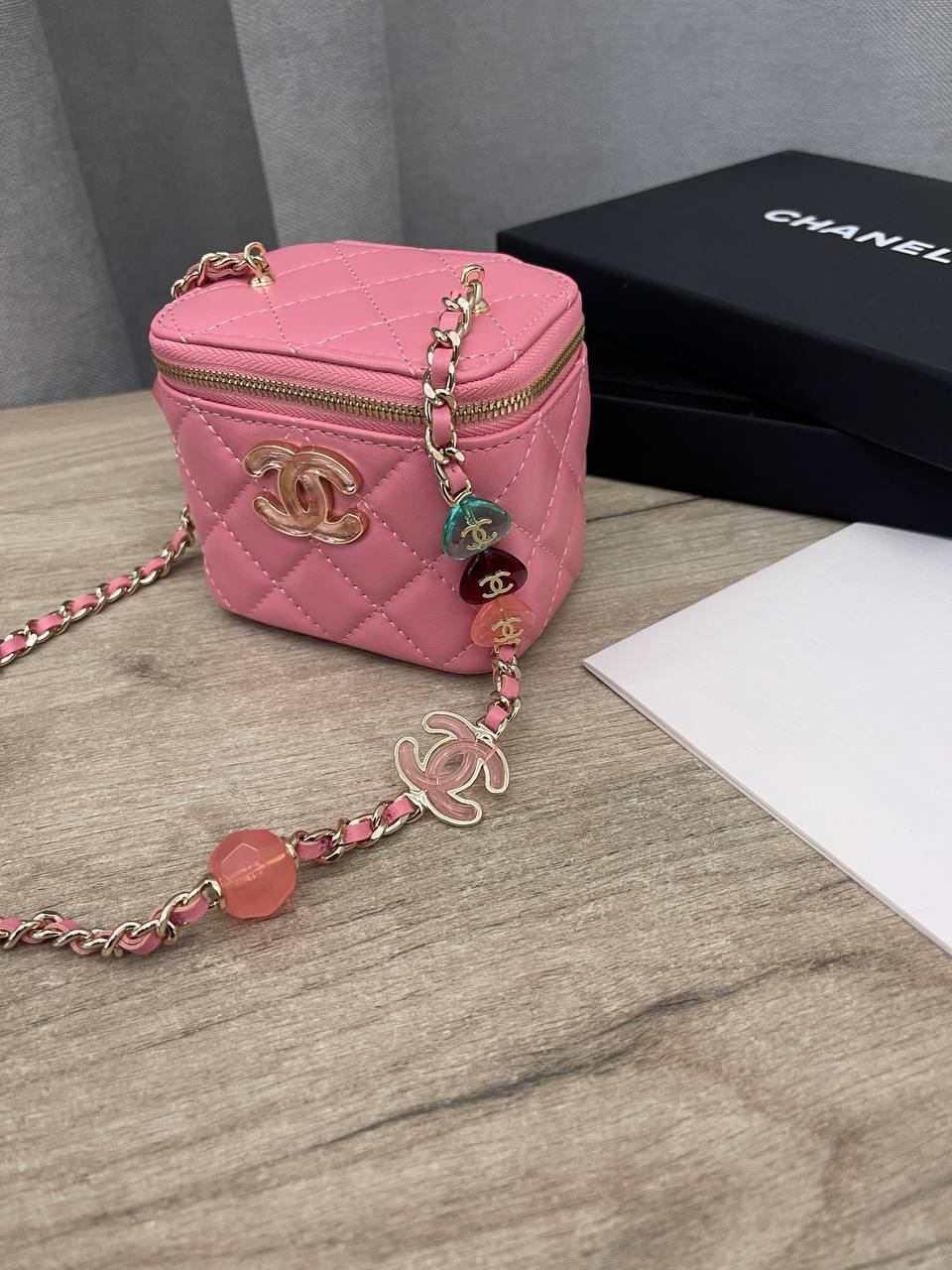 Сумка женская Chanel LUX-101574 выполнена в форме маленького чемоданчика, выполненного в розовом цвете с золотистой фурнитурой. С классическим стеганым узором, сумка имеет короткую ручку-цепочку с бусинами. Отлично подойдет для вечерних выходов и подчеркнет ваш стиль.