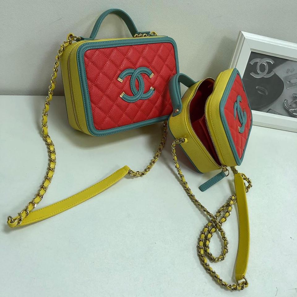 Сумка женская Vanity Chanel LUX-10512 – это яркий и стильный аксессуар, который станет акцентом любого образа. Сочетание насыщенного красного, желтого и бирюзового цветов придает сумке игривый и модный вид. Стеганый узор и узнаваемый логотип бренда подчеркивают ее элегантность. Сумка идеально подойдет для создания эффектных повседневных и вечерних образов.