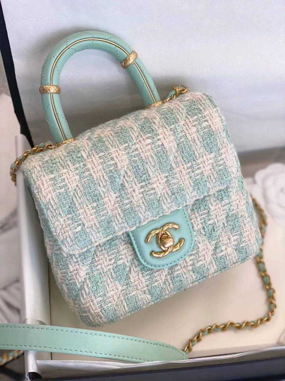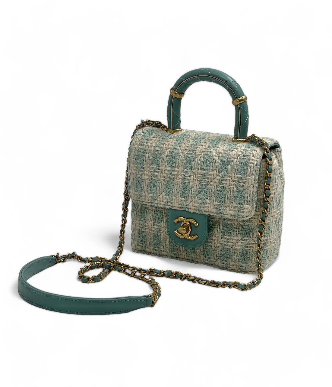 Сумка женская Chanel LUX-93426, выполнена в классическом стиле. Она сочетает в себе нежный мятный цвет с белым узором ткани. Такая сумка станет отличным дополнением к повседневному образу, добавляя нотку элегантности.
