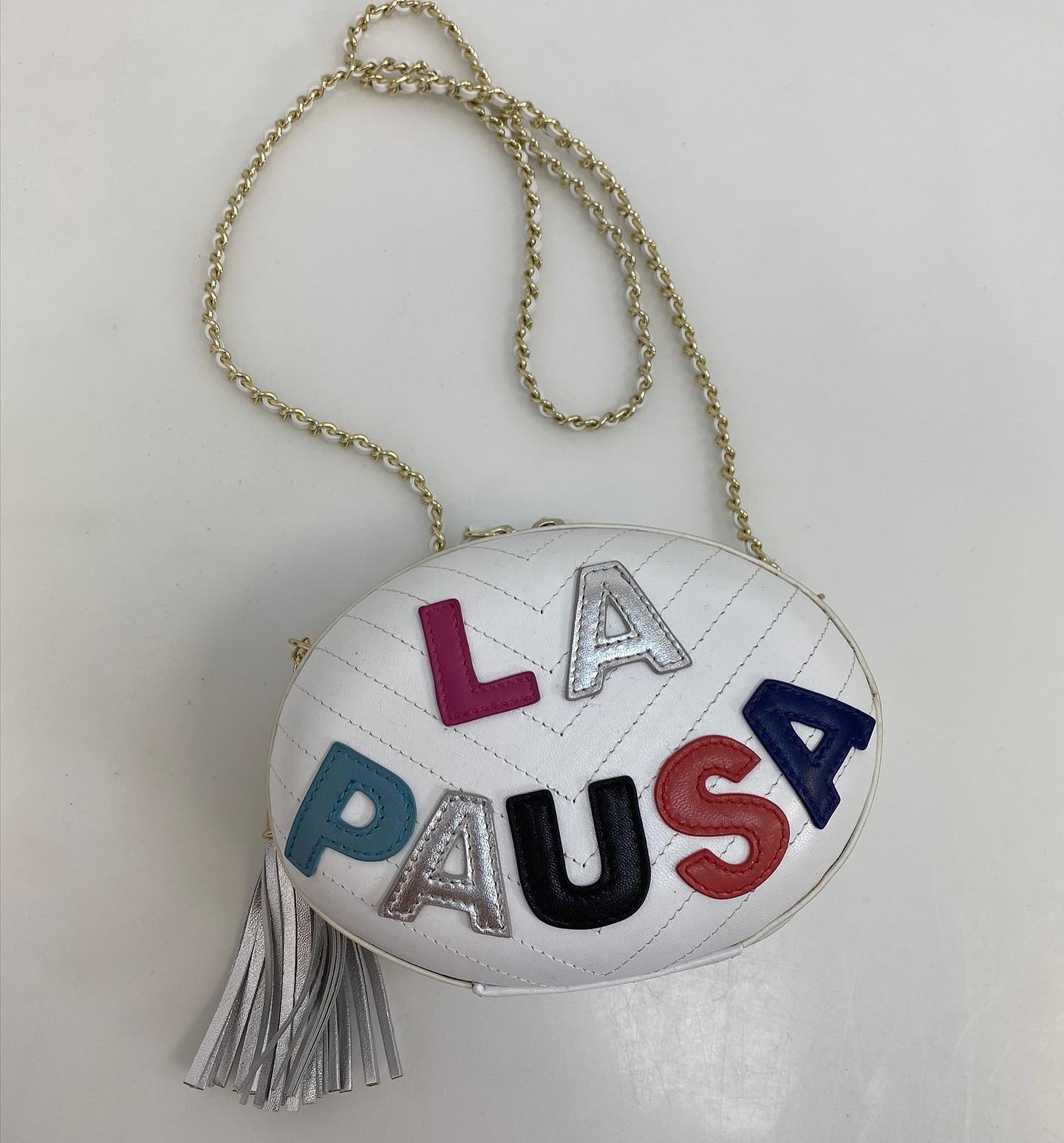 Эта женская сумка Chanel LUX-42828 выполнена в ярком и запоминающемся дизайне, который подчеркнет вашу индивидуальность. Круглая форма и объемная аппликация из цветных букв, складывающихся в надпись "LA PAUSA", делают ее идеальным аксессуаром для создания эффектного образа. Подойдет как для повседневного использования, так и для особых случаев, добавляя игривости и шика.