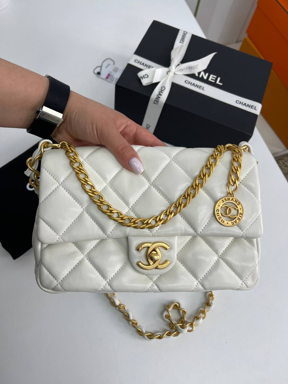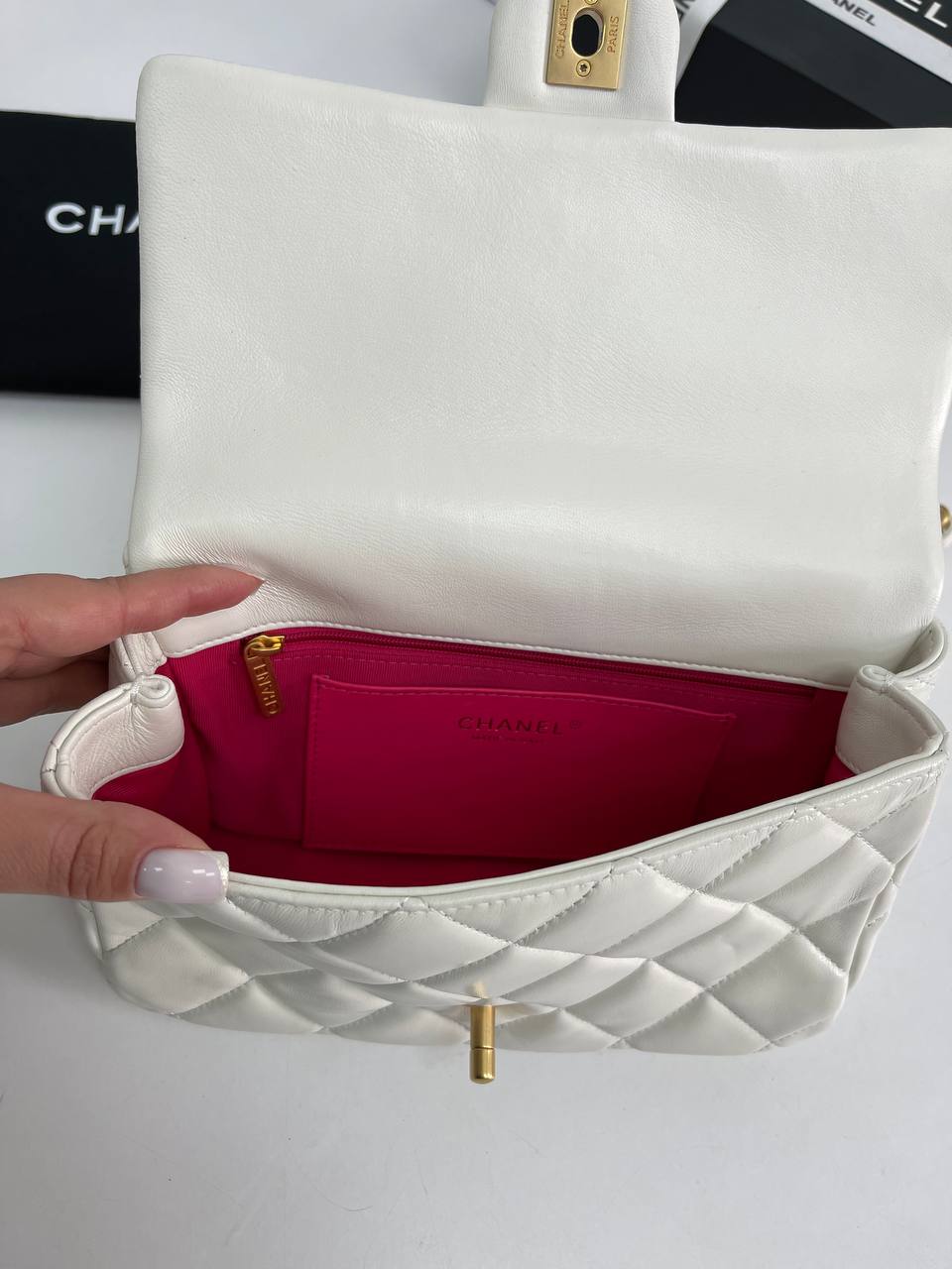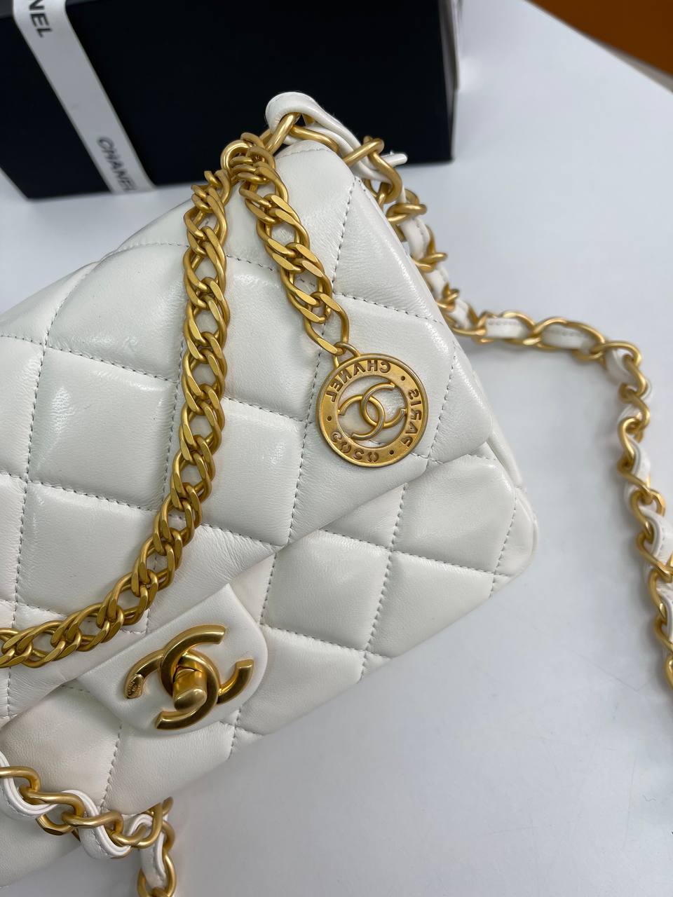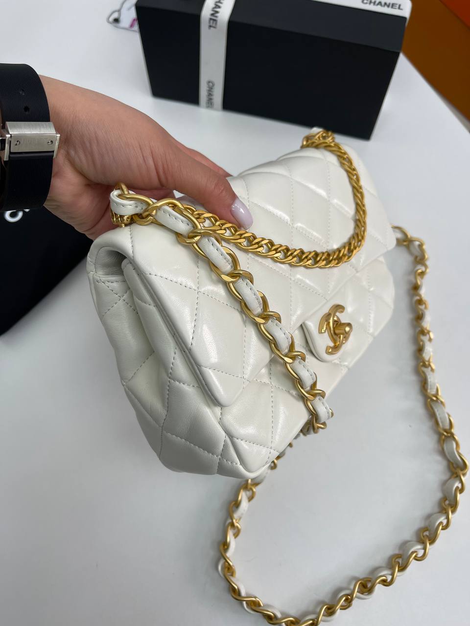 Сумочка женская Chanel LUX-89420, представленная на изображении, выполнена в классическом стиле и имеет элегантный внешний вид. Она выполнена в белом цвете с характерной стеганой текстурой и украшена золотистой фурнитурой. Этот аксессуар идеально подойдет для создания как повседневных, так и вечерних образов.