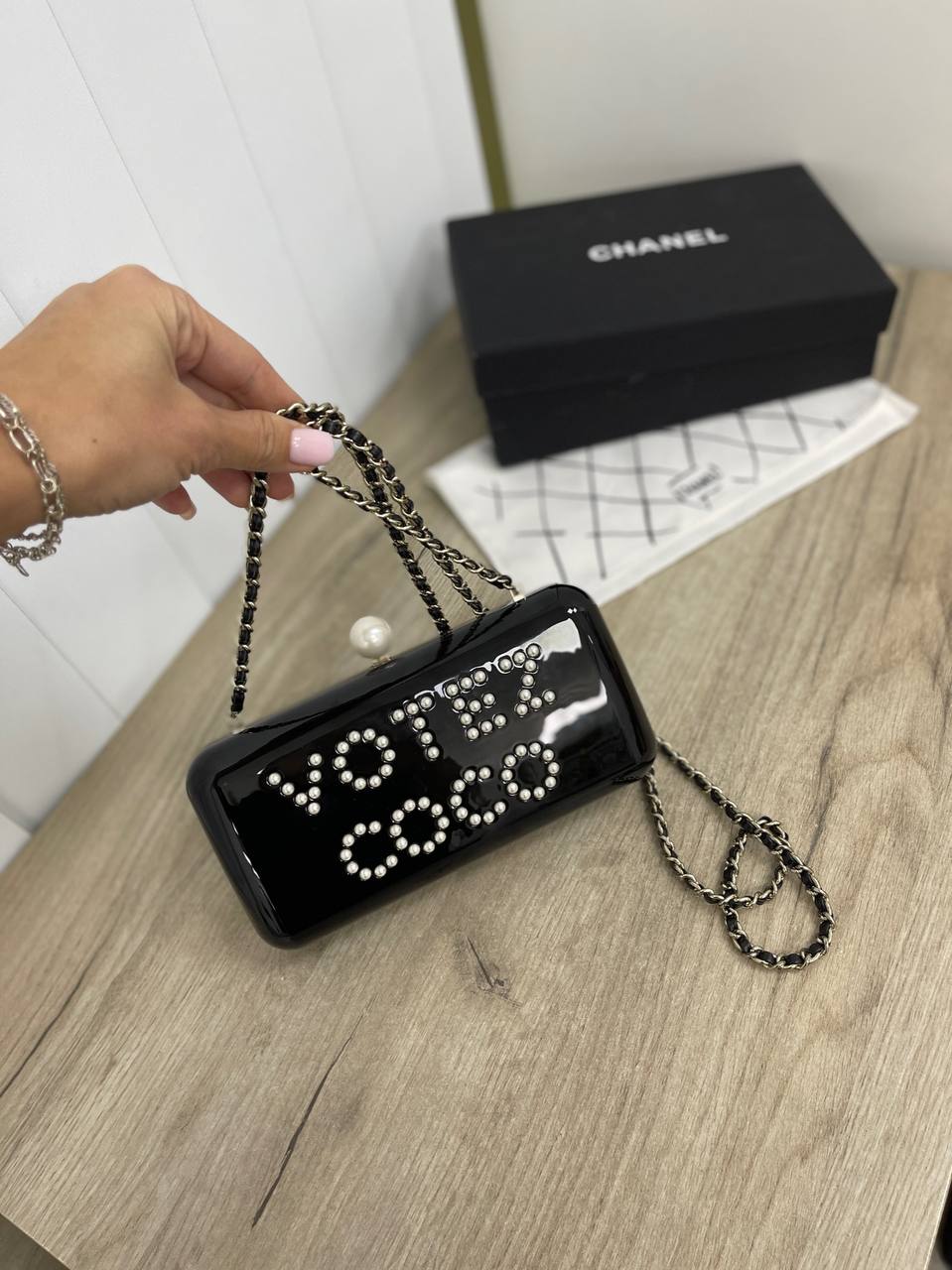 Сумка женская Chanel LUX-74876 представляет собой стильный аксессуар в вечернем стиле. Чёрная лакированная поверхность сумки украшена надписью "VOTRE COCO", выполненной из декоративных элементов, что добавляет изделию эксклюзивности. Сумка обладает классическим дизайном, который подойдет для различных мероприятий.