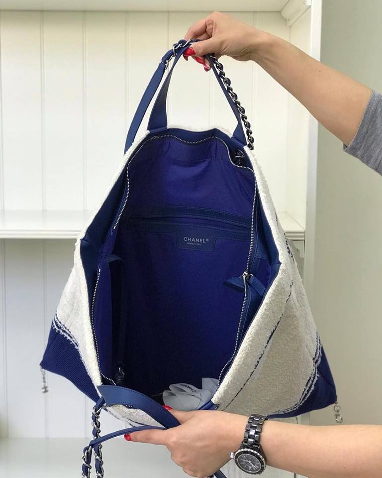 Сумка женская SHOPPING Chanel LUX-11589 выполнена в элегантном и просторном дизайне, идеально подходящем для повседневного использования. Сочетание текстурного основного материала и контрастных синих деталей, включая крупный логотип бренда, придает сумке узнаваемый стиль. Длинные ручки, усиленные цепочками, обеспечивают удобство ношения как в руке, так и на плече.