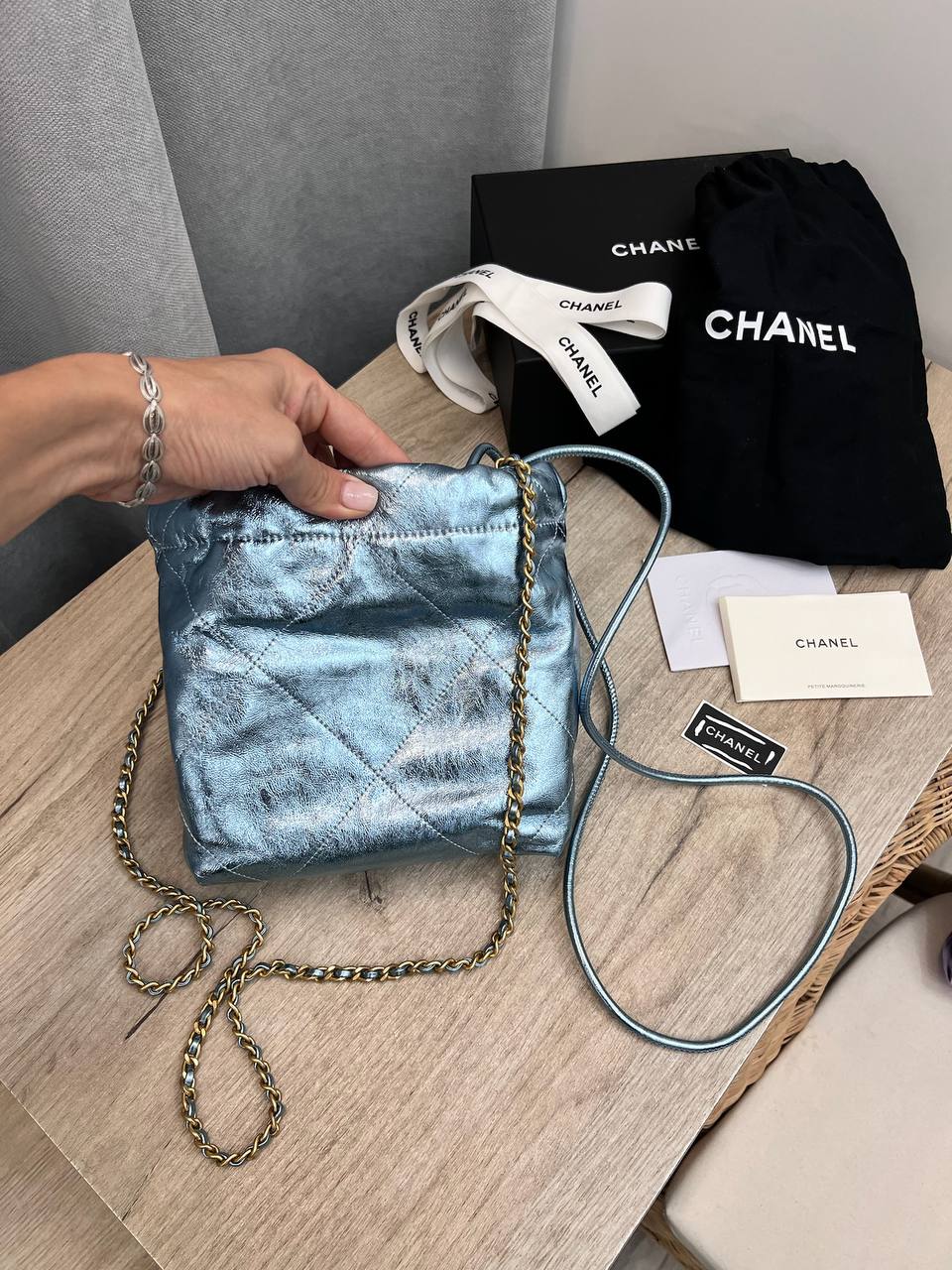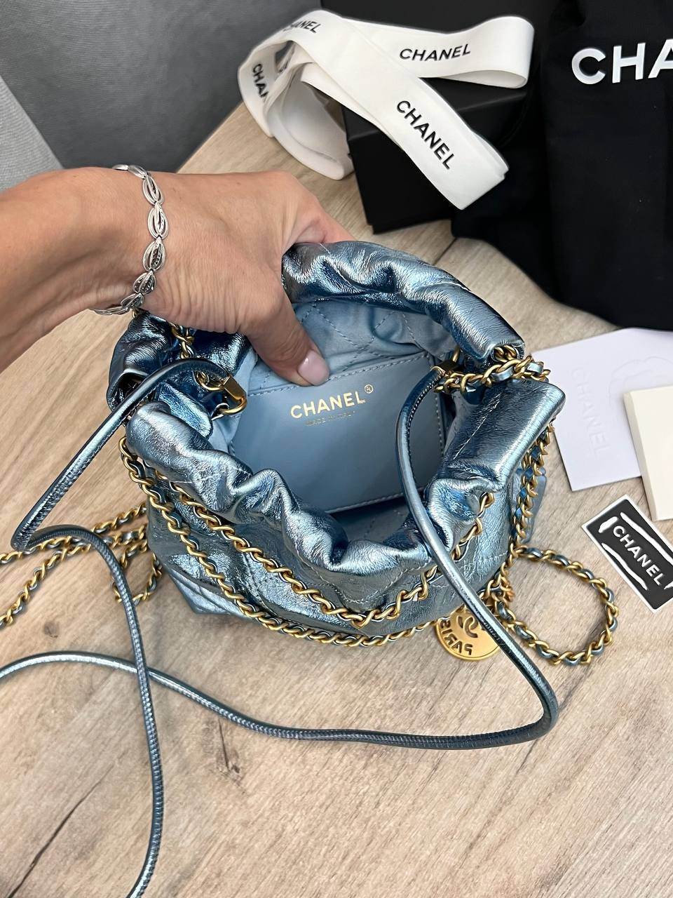 Женская сумка Chanel LUX-108755 представляет собой стильный аксессуар от известного бренда. Сумка выполнена в уникальном голубом цвете с металлическим блеском, что придает ей неповторимый вид. Она имеет элегантный дизайн и будет идеальным дополнением к любому образу.