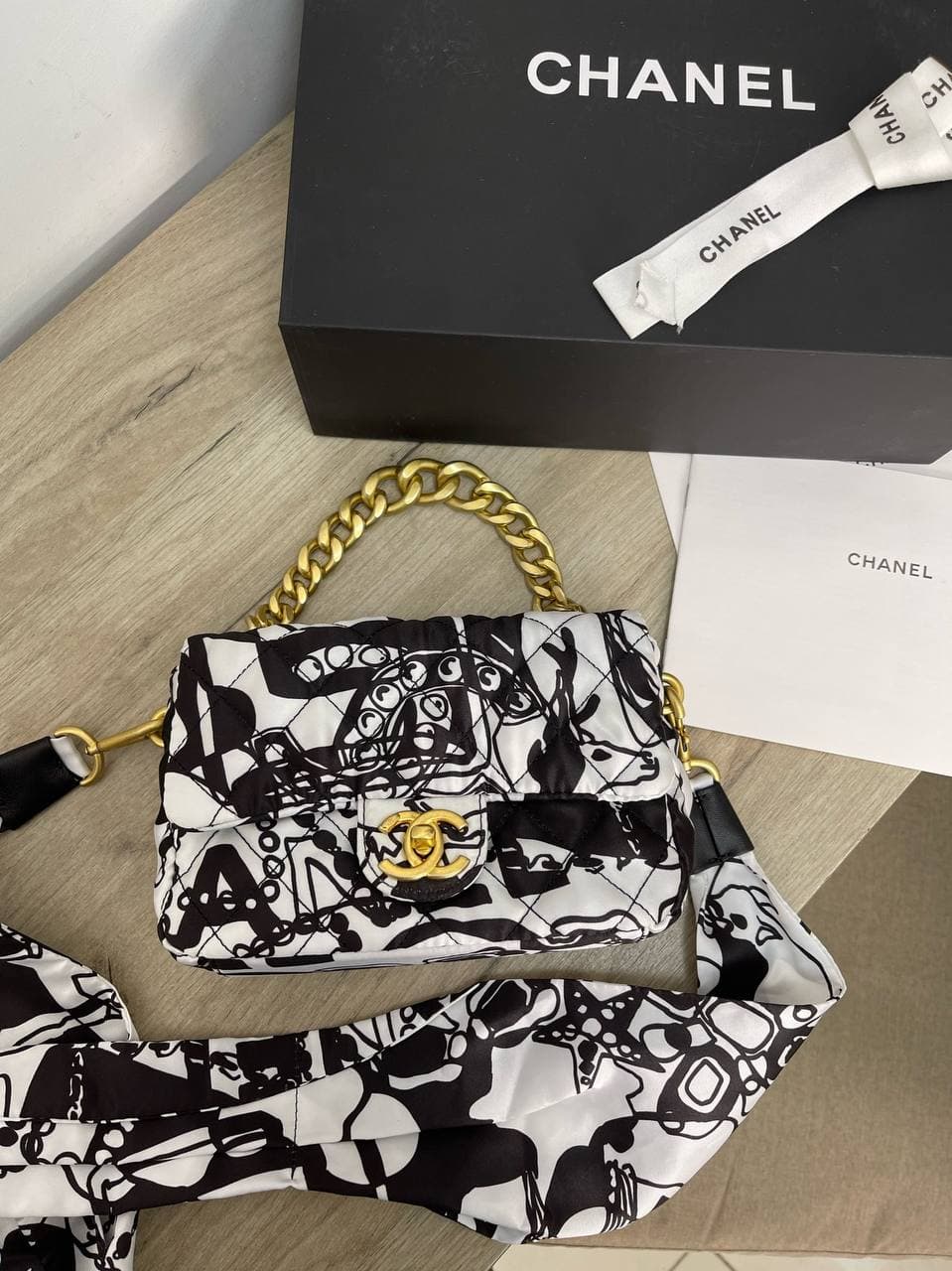 Эта женская сумка Chanel LUX-61359 отличается уникальным дизайном и высоким качеством исполнения. Модель выполнена в черно-белой цветовой гамме с оригинальным принтом, который придает ей артистичный и современный вид. Благодаря своей компактности и изысканному дизайну, сумка станет идеальным дополнением к повседневному или вечернему образу, подчеркивая ваш неповторимый стиль.