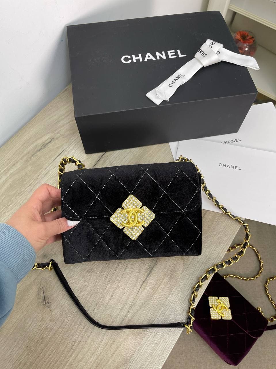Сумка женская Chanel LUX-61367 представляет собой элегантный аксессуар в классическом стиле. Черный бархатистый материал придает ей роскошный вид, а контрастная стежка ромбами подчеркивает изысканный дизайн. Центральным элементом является золотистая фурнитура с узнаваемым логотипом бренда, инкрустированная кристаллами, что добавляет изделию сияния и утонченности. Эта сумка станет идеальным дополнением к вечернему или коктейльному образу, придавая ему завершенность и шик.