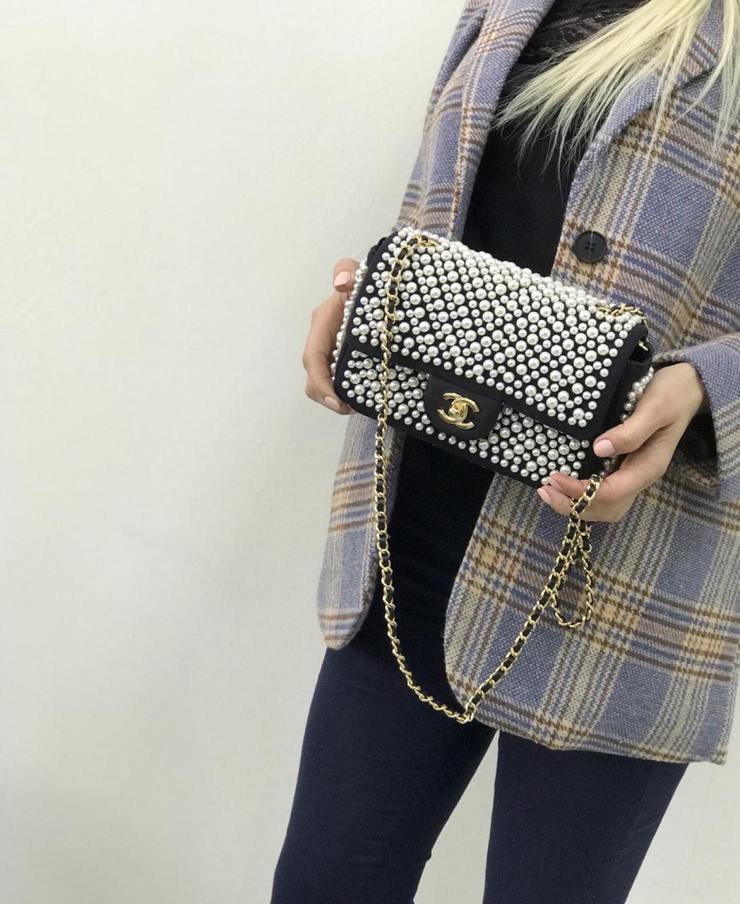 Сумка женская Classic 2.55 Chanel LUX-12925 – это изысканный аксессуар, который добавит шика любому образу. Черная сумка, украшенная многочисленными жемчужными бусинами, выполнена в классическом стиле Chanel. Наличие золотой цепочки-ремешка делает ее элегантной и утонченной, а культовый логотип бренда подчеркивает ее премиальность. Эта сумка идеально подходит для особых случаев и вечерних выходов, являясь воплощением роскоши и стиля.