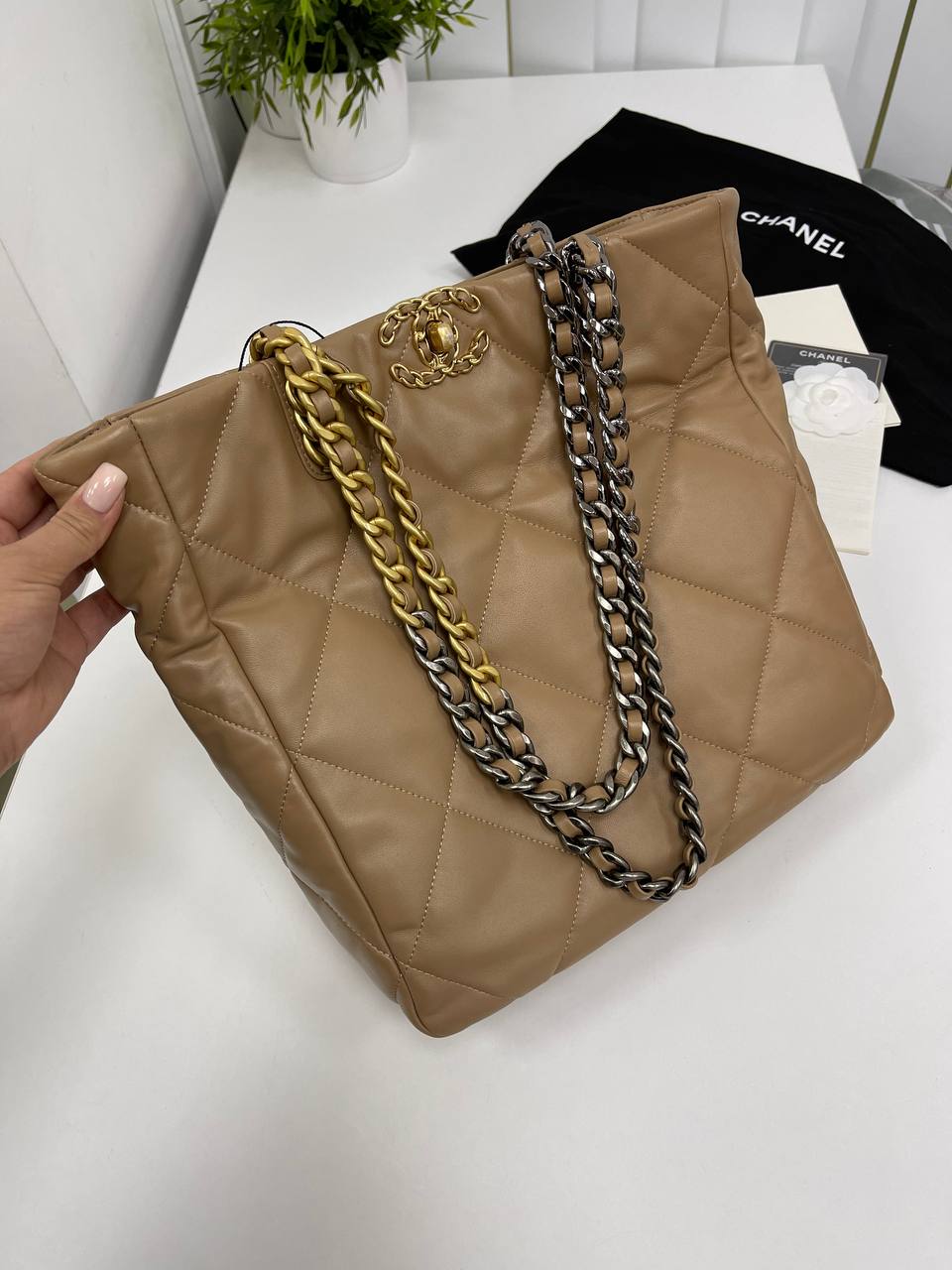 Сумка женская Chanel LUX-78421 – это воплощение элегантности и стиля от известного бренда. Сумка выполнена в нежном бежевом цвете с ромбовидной стежкой. Акцент сделан на металлических цепочках двух оттенков, которые служат как ручками, придавая ей современный и роскошный вид.