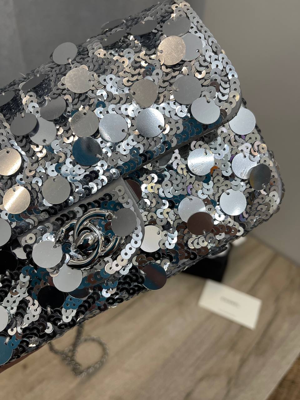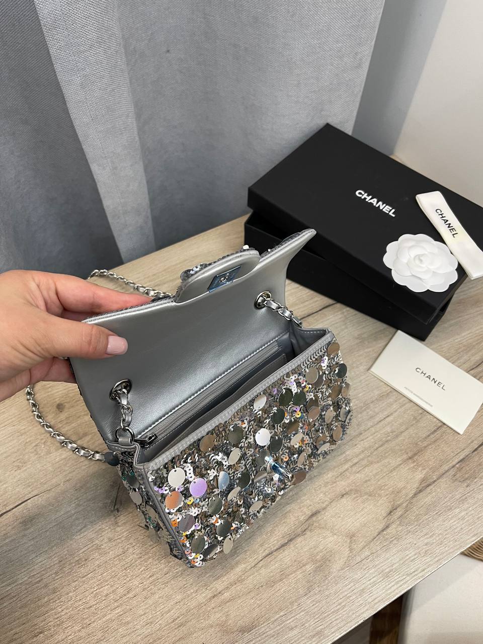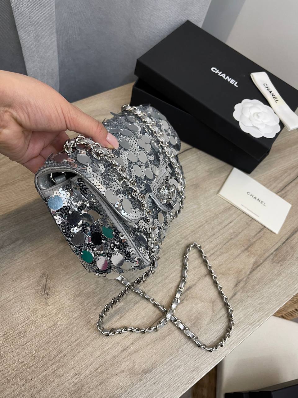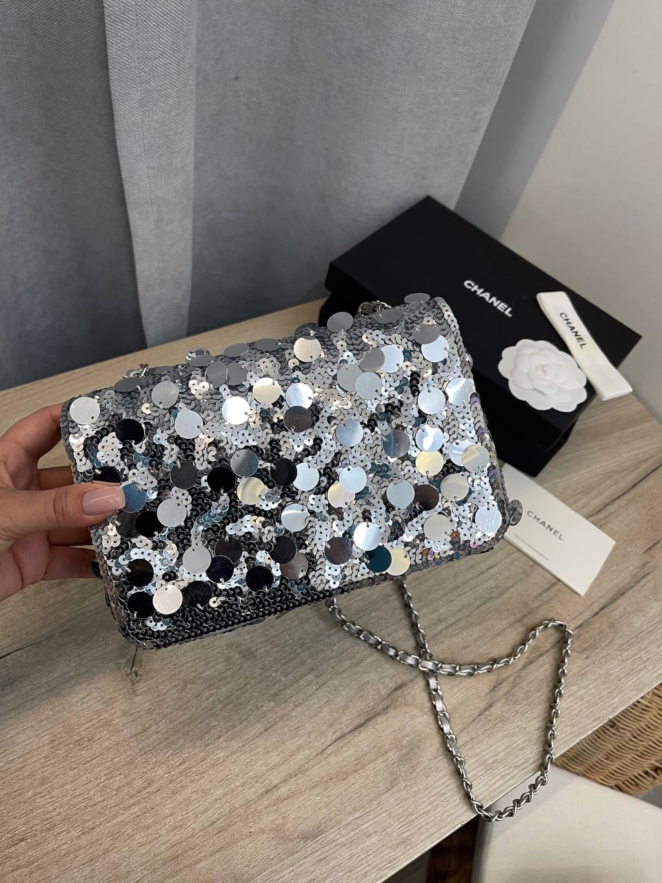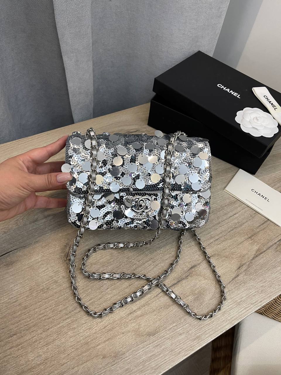Сумка женская Chanel LUX-103560 представляет собой элегантный аксессуар, подчеркивающий индивидуальность и стиль. Она выполнена в серебристом цвете с блестящей текстурой, идеально подходит для создания яркого и запоминающегося образа. Сумка может быть использована как для повседневных выходов, так и для особых случаев, добавляя нотку роскоши.