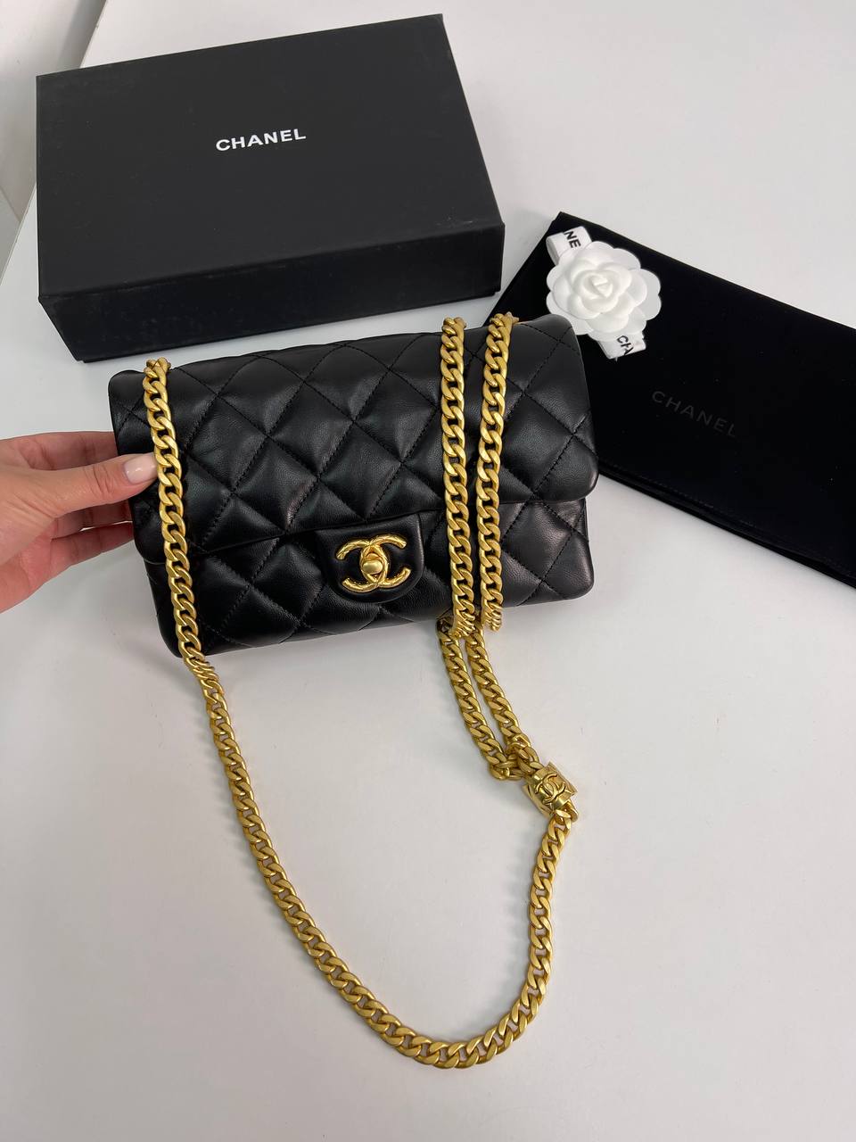 Сумка женская Chanel LUX-78696 – это воплощение элегантности и стиля от известного бренда. Черная стеганая сумка, оснащенная золотистой цепочкой, идеально подходит для создания изысканных образов. Она сочетает в себе классический дизайн и современное исполнение, делая ее универсальным аксессуаром для различных событий.