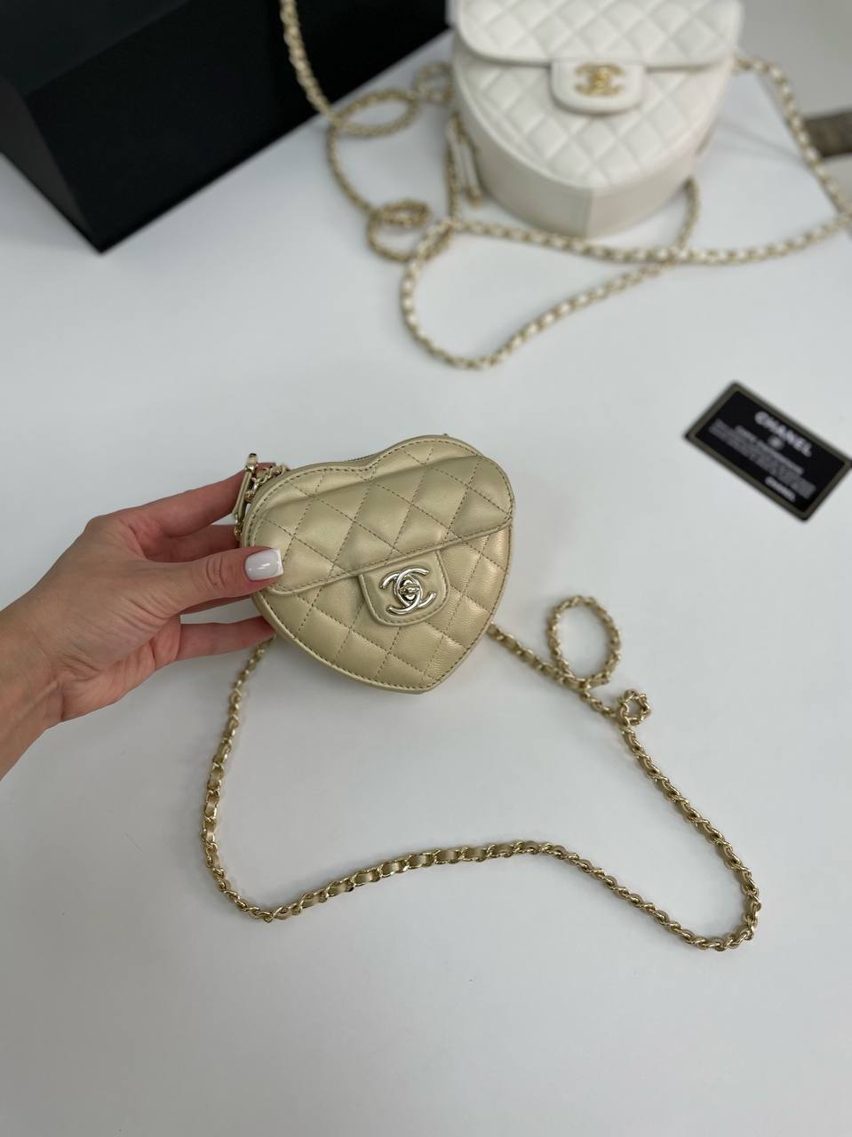 Эта изящная сумка женская Chanel LUX-67902 выполнена в форме сердца, что придает ей неповторимый романтичный шарм. Аккуратная стежка и узнаваемый логотип бренда подчеркивают элегантность модели. Золотистый оттенок и блестящая цепочка делают эту сумку идеальным аксессуаром для создания запоминающихся вечерних или праздничных образов. Она подходит для хранения мелких предметов, таких как ключи, телефон и косметика, добавляя вашему стилю нотку роскоши.