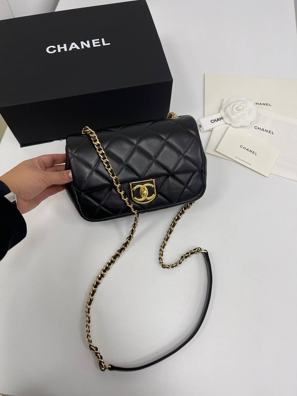 Сумка женская Chanel LUX-78703 - это элегантный аксессуар, выполненный в классическом стиле. Черная стеганая сумка дополнена золотистой фурнитурой и цепочкой. Идеально подходит для повседневного использования, а также для особых случаев.