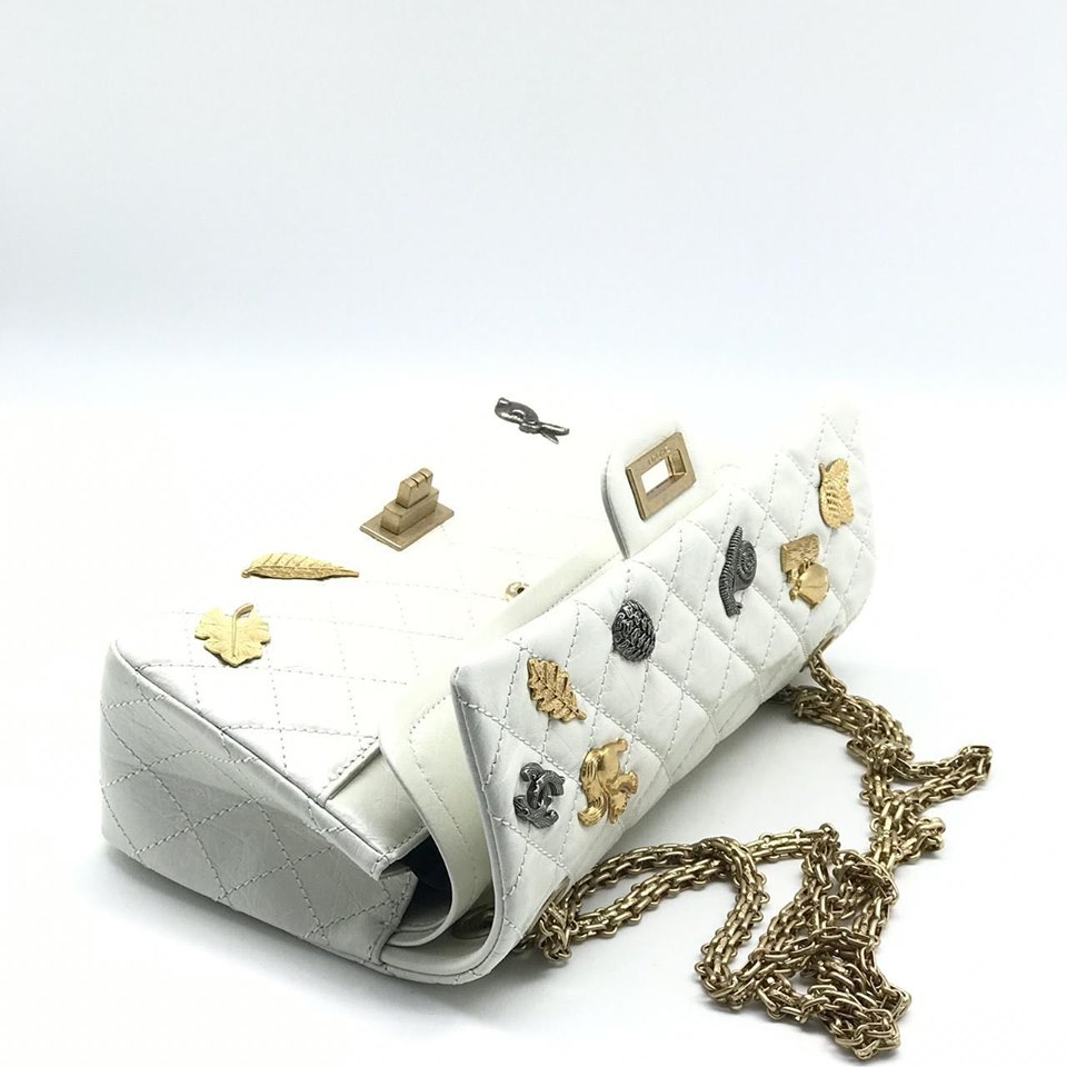 Сумка женская 2.55 Chanel LUX-14077 представляет собой элегантный аксессуар в классическом стиле, дополненный оригинальными декоративными элементами. Мягкая белая кожа с характерной прострочкой придает сумке утонченный вид, а изящная фурнитура подчеркивает роскошь. Эта модель станет идеальным выбором для создания изысканных образов.