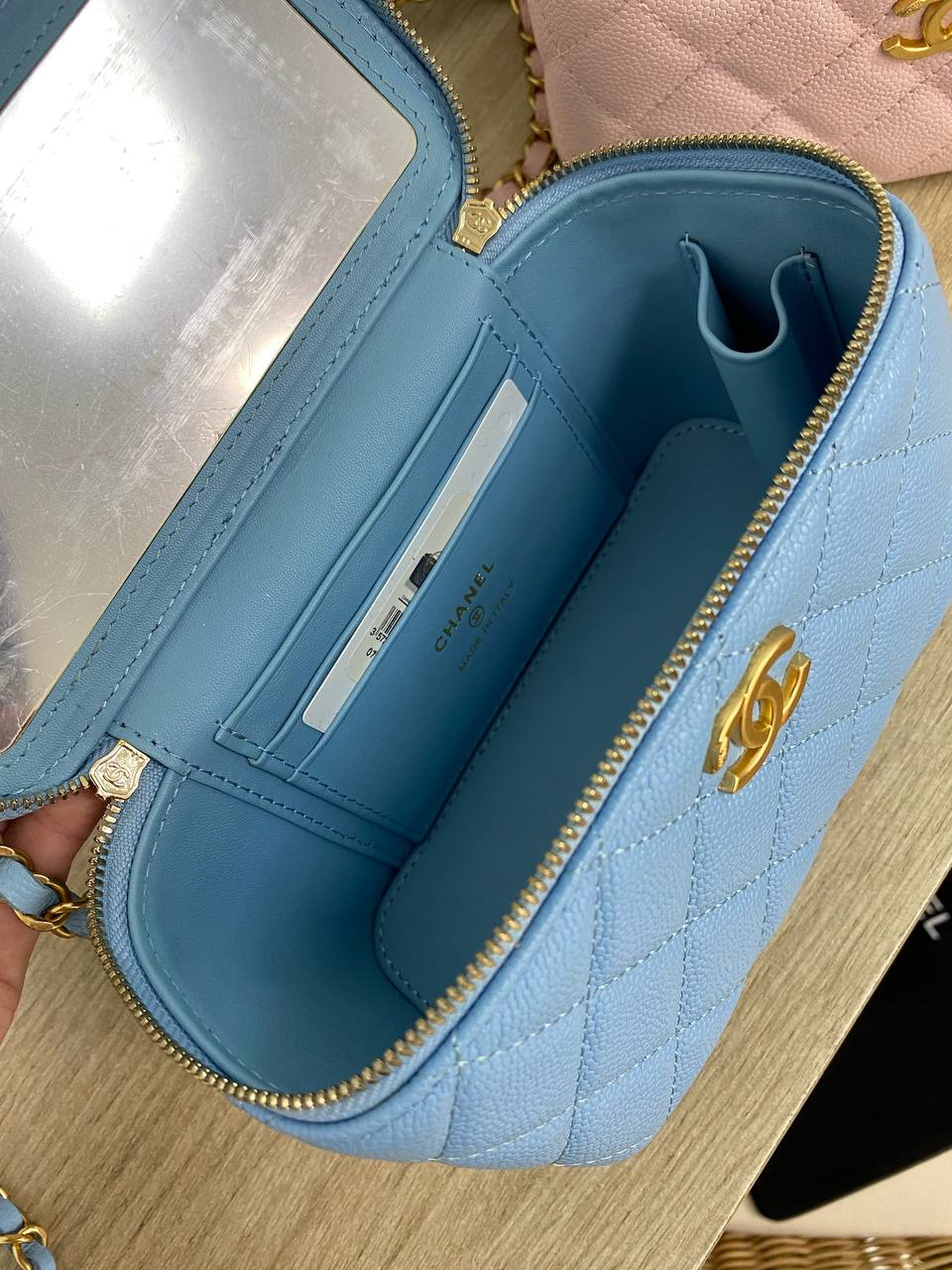 Сумка женская Chanel LUX-84816 представляет собой элегантный аксессуар в фирменном стиле модного дома. Сумка выполнена в нежно-голубом цвете с текстурированной поверхностью. Дизайн включает стеганый узор, узнаваемую фурнитуру, что придает ей изысканный вид и делает ее идеальным дополнением к любому образу.