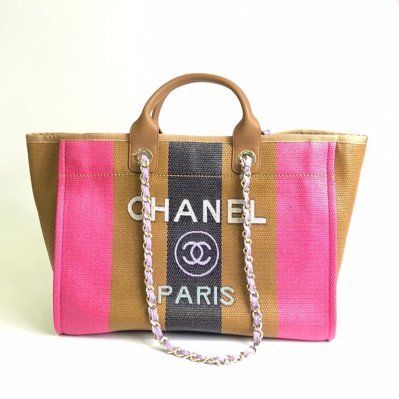 СУМКА ЖЕНСКАЯ SHOPPING CHANEL Chanel LUX-32651 – это стильная и вместительная сумка, выполненная в ярком дизайне с вертикальными полосами розового, бежевого и темно-серого цветов. Аккуратные кожаные ручки и элегантная плетеная цепочка с текстильными вставками добавляют ей изысканности.