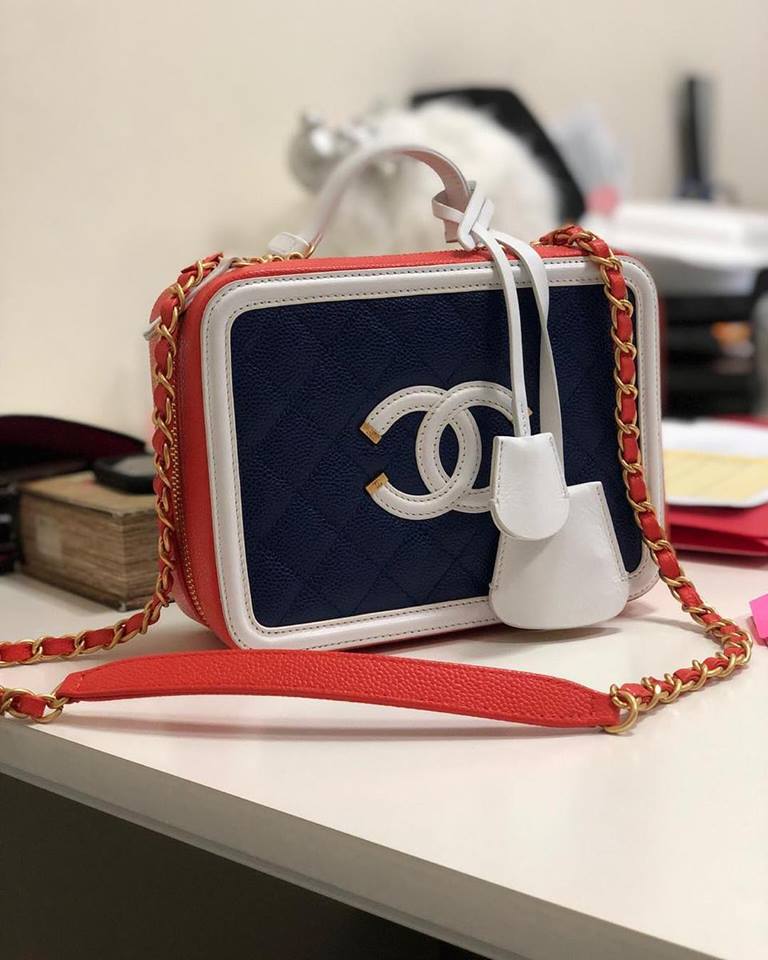 Эта изысканная женская сумка Vanity Chanel СЖ-741 представляет собой воплощение элегантности и роскоши. Выполненная в классическом прямоугольном дизайне, напоминающем косметичку, она обладает узнаваемым стилем бренда Chanel. Комбинация насыщенного темно-синего цвета с контрастной белой отделкой и яркими красными вставками по бокам придает ей уникальный и запоминающийся вид. Логотип Chanel, выполненный в золотистом цвете, является центральным акцентом.