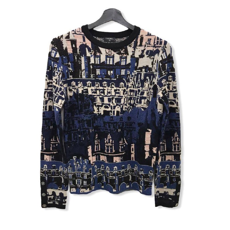 Этот свитер Chanel LUX-53613 представляет собой элегантное изделие с уникальным принтом, напоминающим архитектурный пейзаж. Классический крой и выразительный дизайн делают его стильным дополнением к гардеробу.