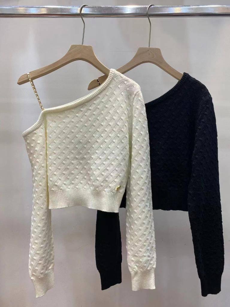 Свитер женский Chanel LUX-95080, представленный на изображении, представляет собой стильный укороченный свитер кремового цвета с асимметричным дизайном, открывающим одно плечо и украшенным цепочкой. Текстурированный узор ткани создает интересный визуальный эффект. Идеально подойдет для создания модных образов в демисезонный период.