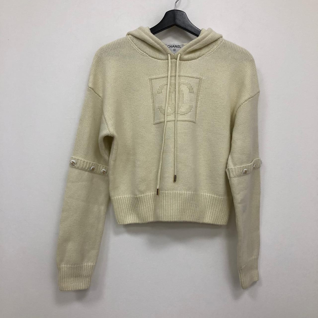 Женский свитер Chanel LUX-37857 представлен в кремовом цвете и выполнен в элегантном стиле. Модель отличается объемным логотипом бренда на груди и декоративными элементами на рукавах, добавляющими изысканности. Это универсальный вариант для создания стильных образов.