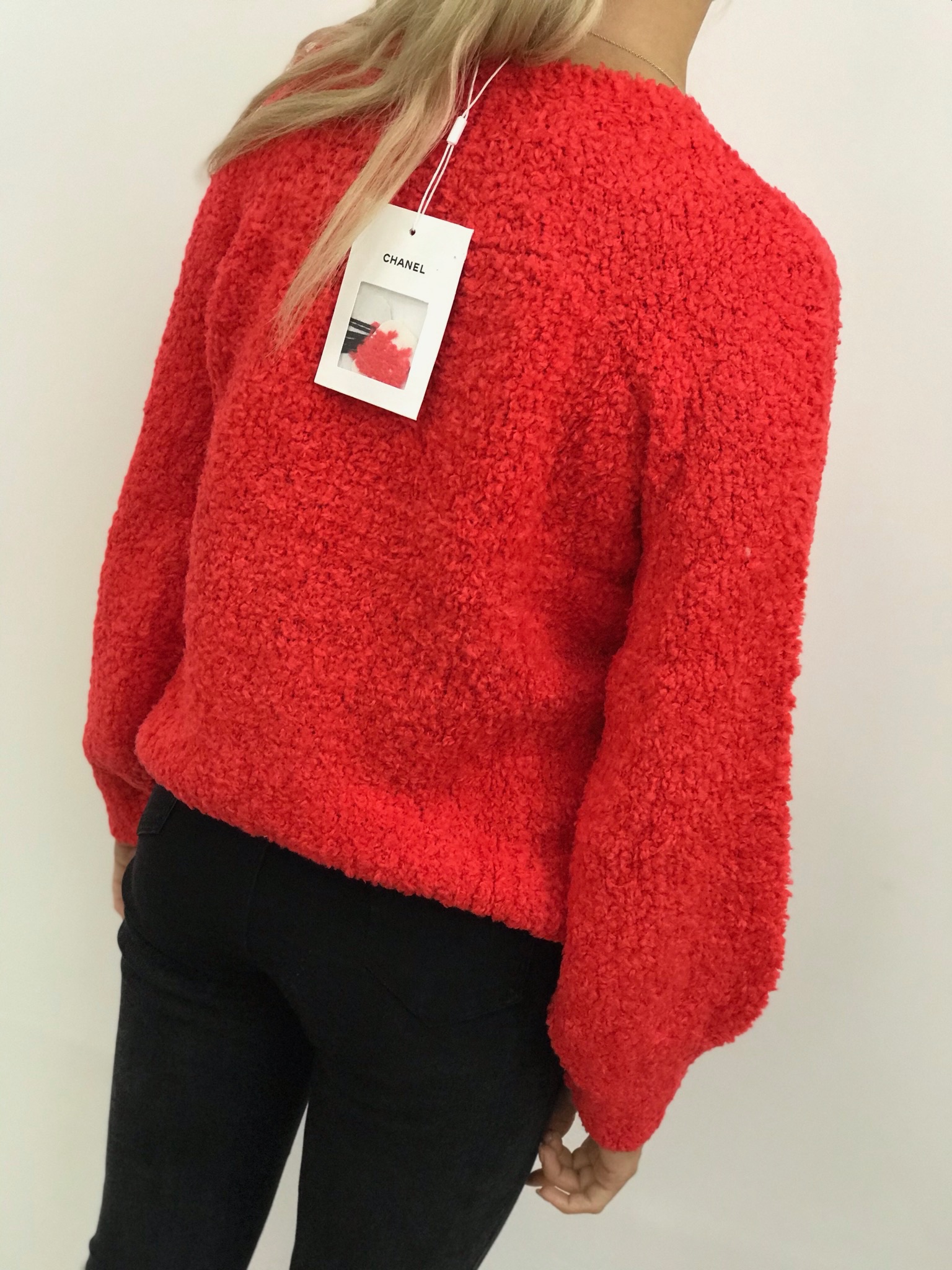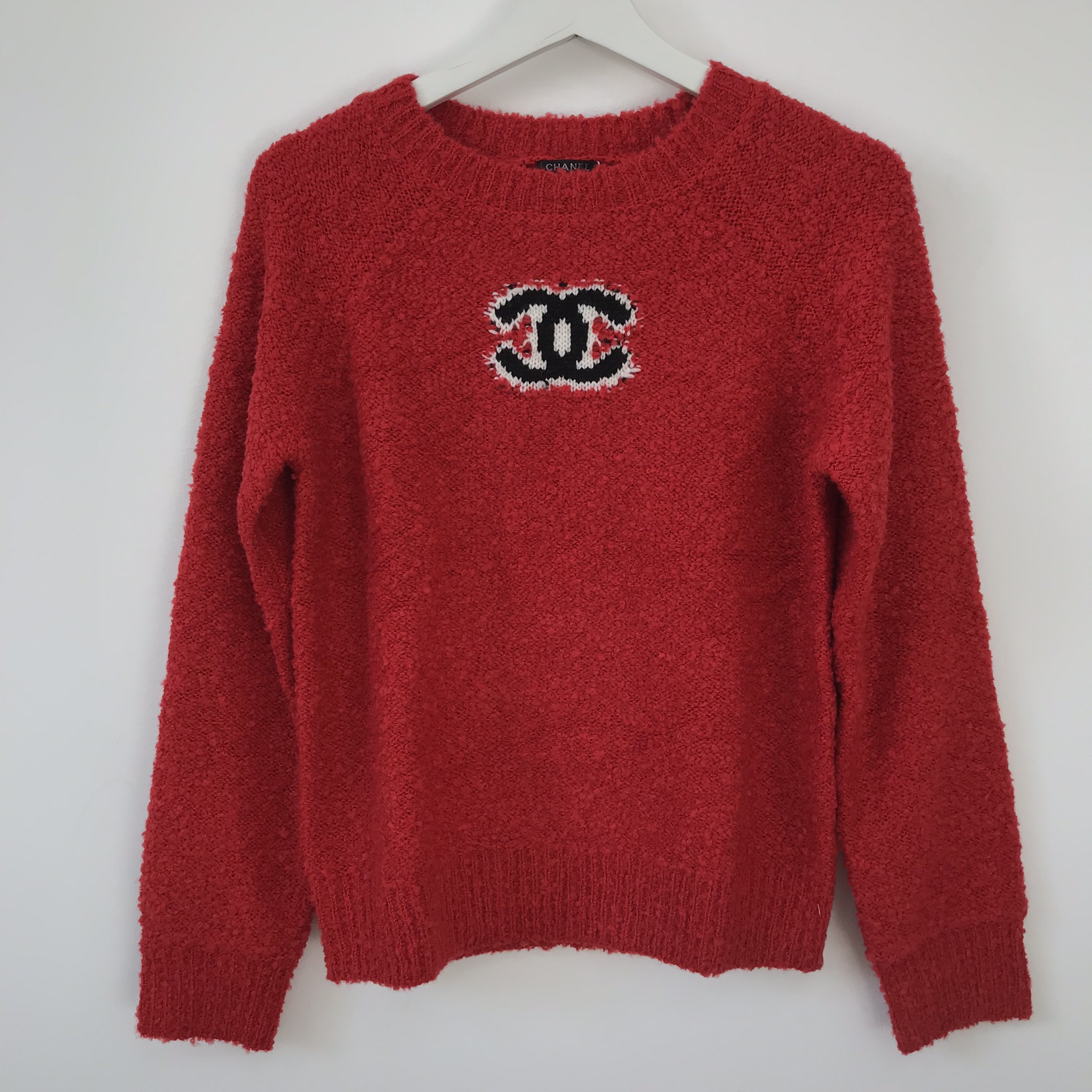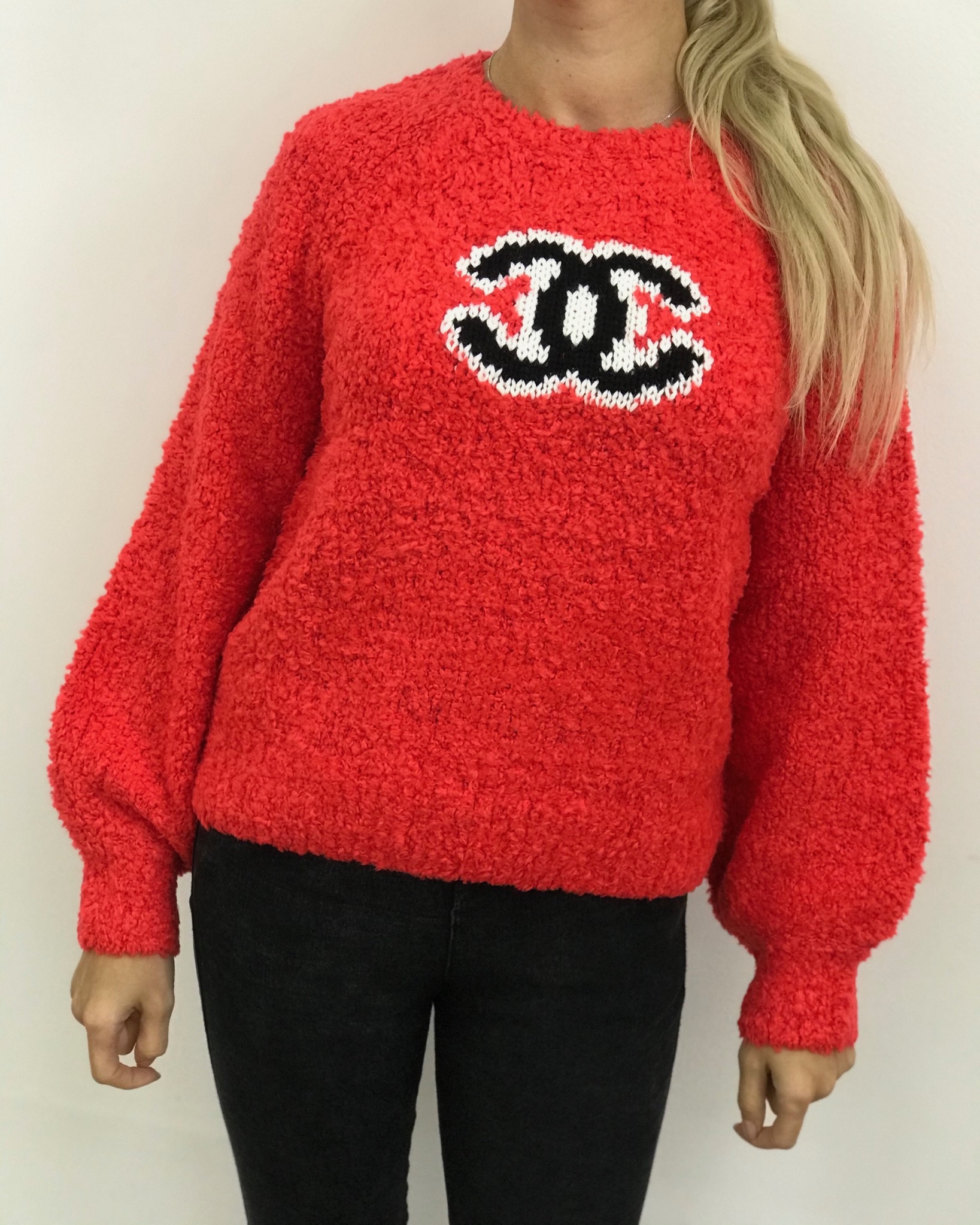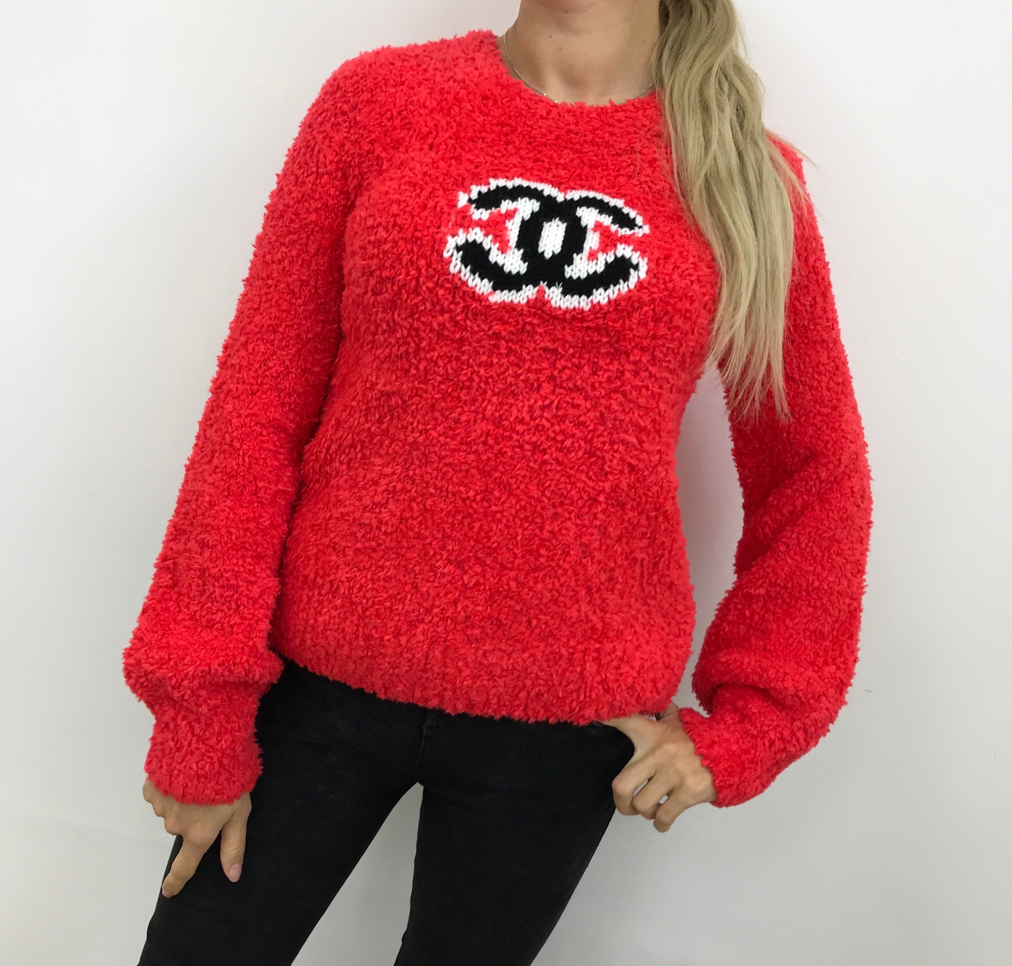 Этот яркий женский свитер Chanel LUX-17930 выполнен в насыщенном красном цвете и имеет объемную, приятную на ощупь фактуру. На передней части изделия расположен узнаваемый логотип бренда Chanel, выполненный в технике аппликации из ниток контрастных черного и белого цветов. Модель имеет классический прямой крой с длинными рукавами и круглым вырезом горловины, что делает ее универсальной для создания различных образов.