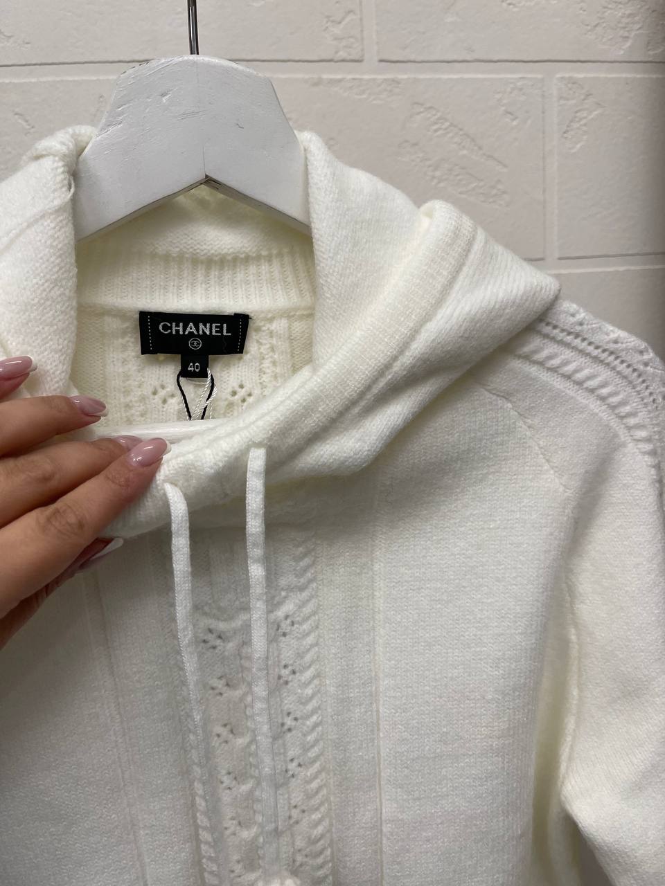 Свитер женский Chanel LUX-111998, представлен в белом цвете. Стильный свитер с капюшоном и декоративными элементами. Прекрасно подойдёт для создания как повседневных, так и более элегантных образов.