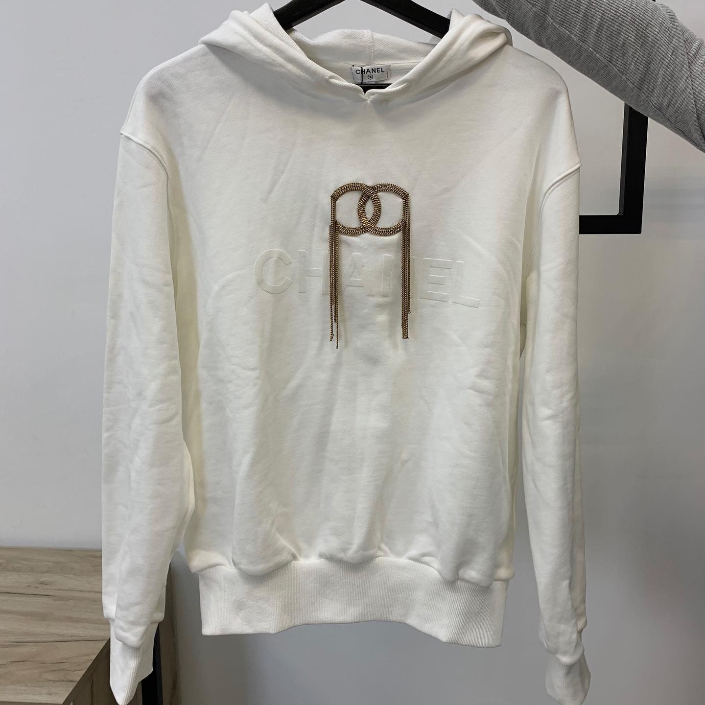 Женская толстовка Chanel LUX-35059 представляет собой стильное и комфортное дополнение к повседневному гардеробу. Эта модель выполнена в классическом дизайне с капюшоном и декорирована узнаваемым логотипом бренда, выполненным в виде объемной вышивки и украшенным золотистыми цепочками. Толстовка идеально подходит для создания расслабленных, но элегантных образов.