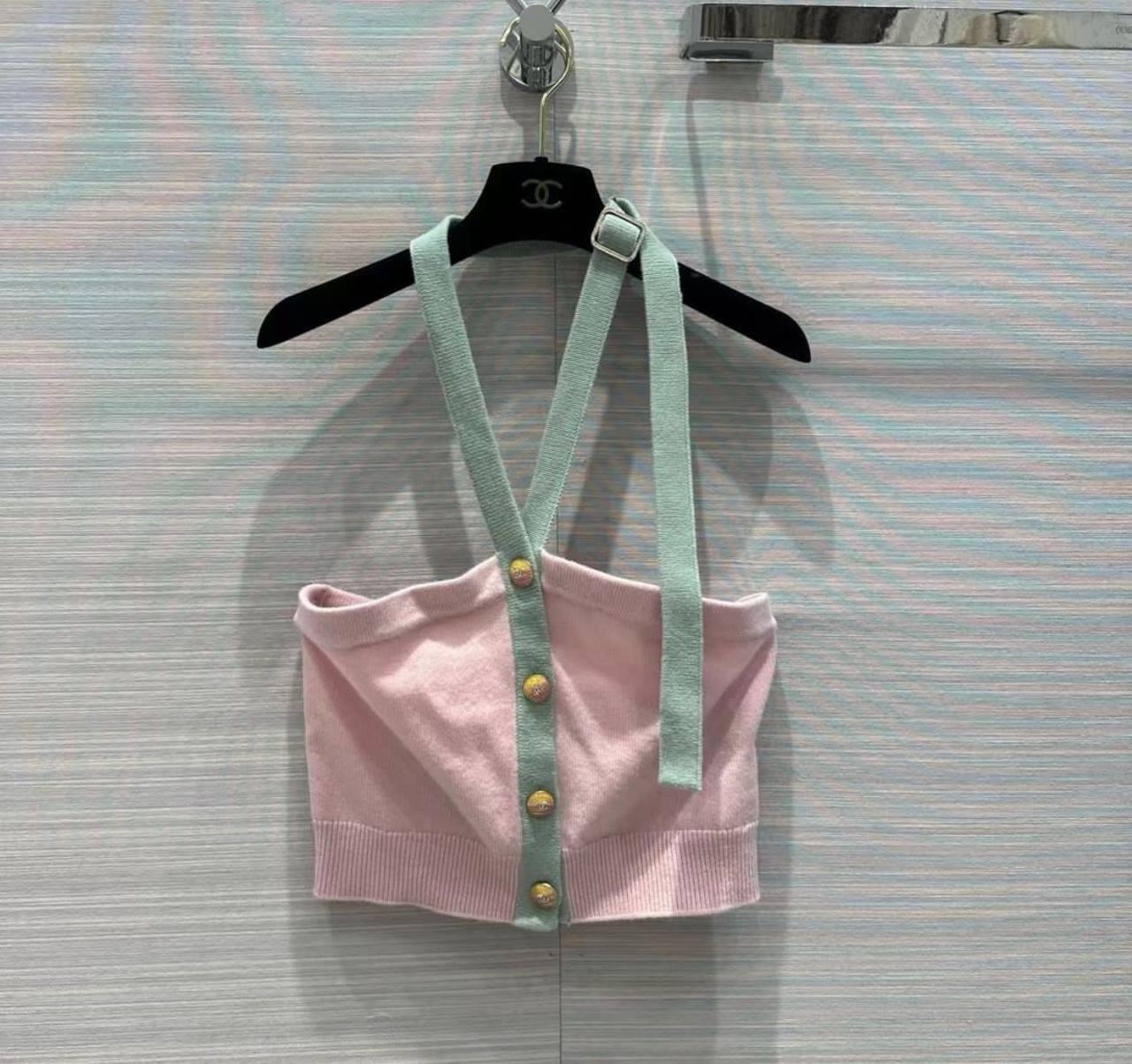 Топ Chanel LUX-101540 — это стильный предмет гардероба от известного бренда. Розовый топ, украшенный декоративными пуговицами и контрастными лямками мятного цвета, представляет собой воплощение элегантности и изысканности. Он идеально подойдет для создания как повседневных, так и более формальных образов.