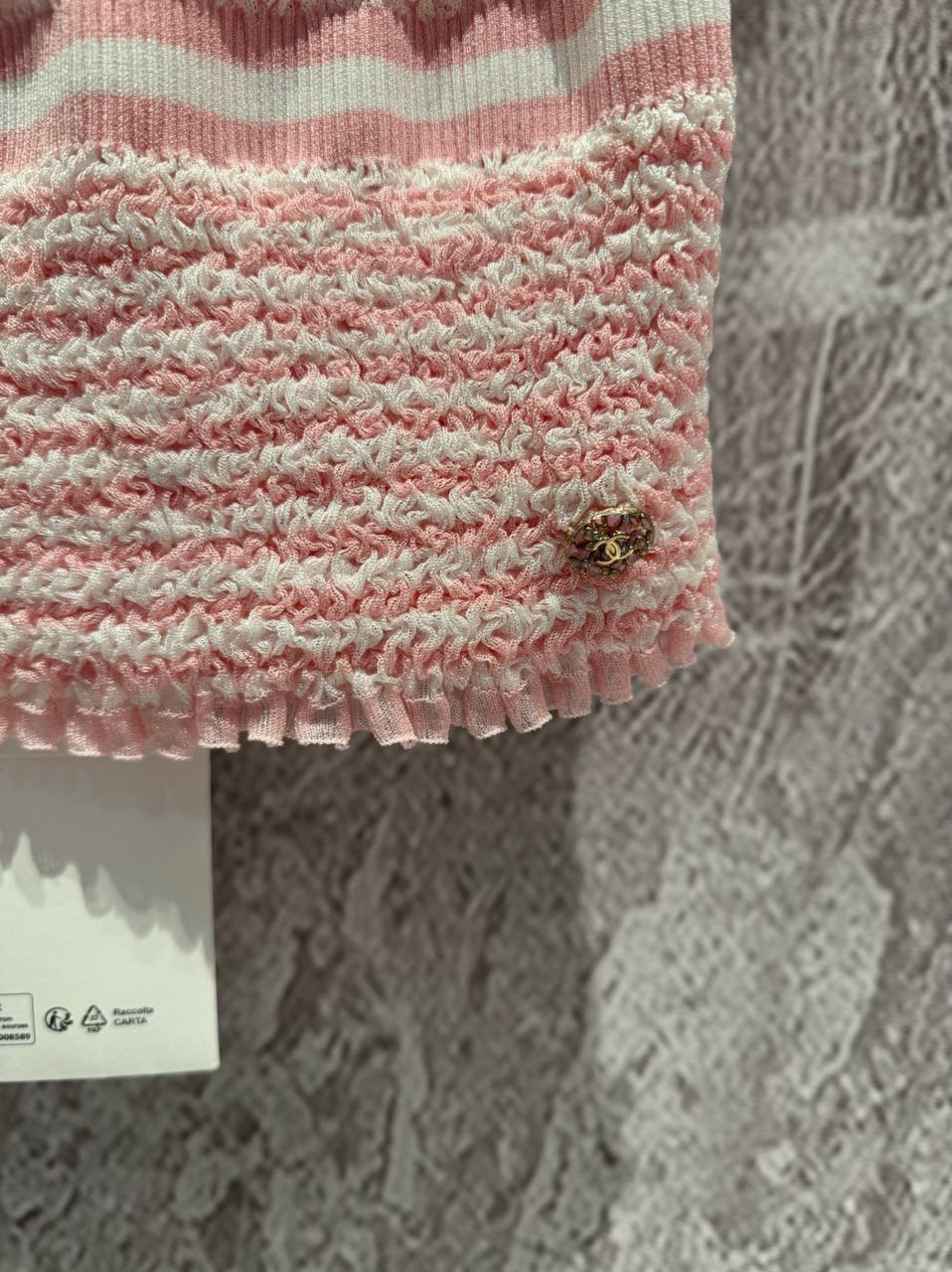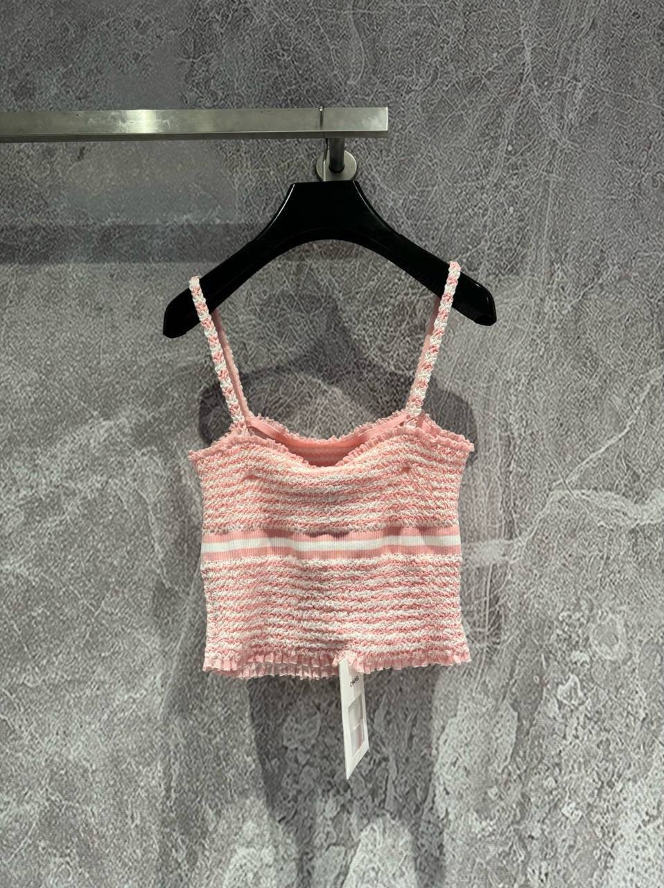 Топ Chanel LUX-107081 — это женский топ, выполненный в повседневном стиле. Он выполнен в нежно-розовом цвете с белыми полосами. Топ украшен сборками, что придает ему элегантный вид.