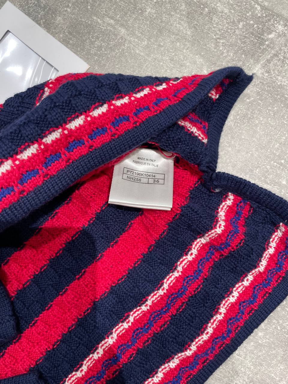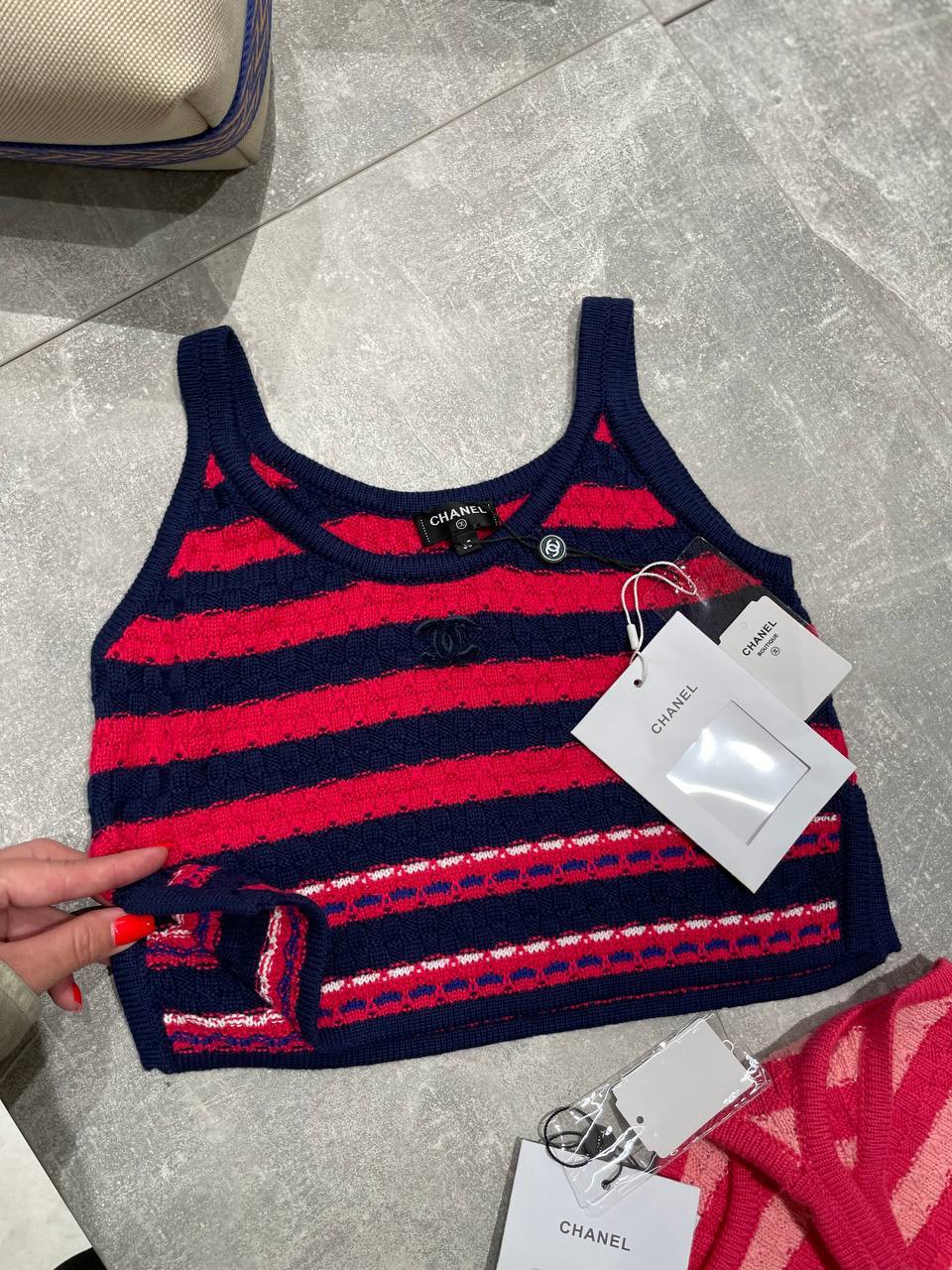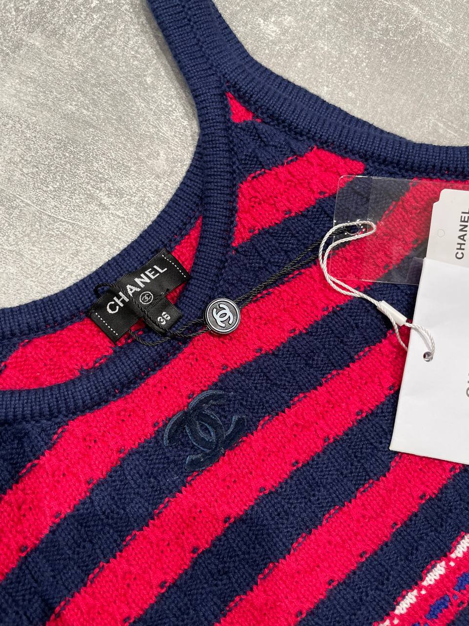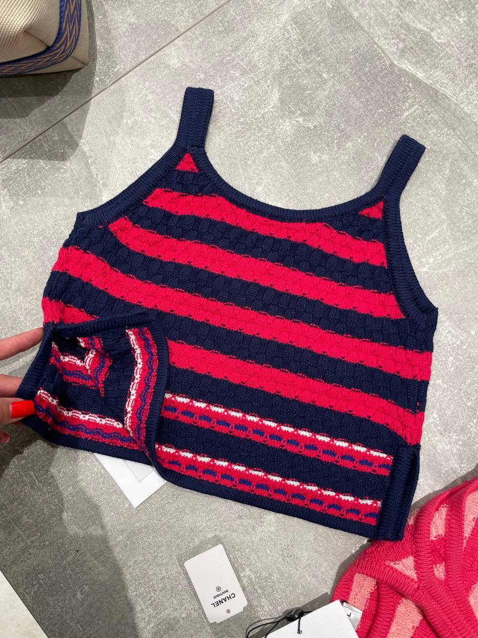 Топ Chanel LUX-118739 представляет собой стильный предмет гардероба от известного бренда. Яркий дизайн в красную и темно-синюю полоску придает топу особую выразительность и привлекательность. Идеально подходит для создания модных и запоминающихся образов.