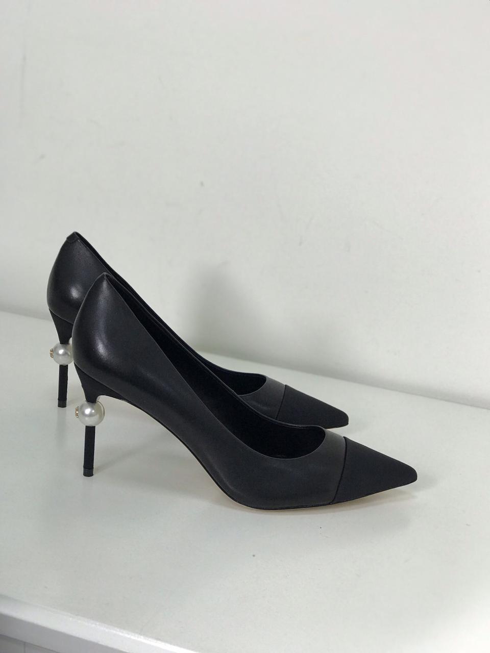 Туфли женские Chanel LUX-13513 – это элегантная обувь, сочетающая в себе классический дизайн и изысканные детали. Эти остроносые туфли на высоком каблуке, украшенные жемчужными элементами, добавят утонченности любому образу. Они идеально подойдут для особых случаев или для создания делового, но стильного наряда.