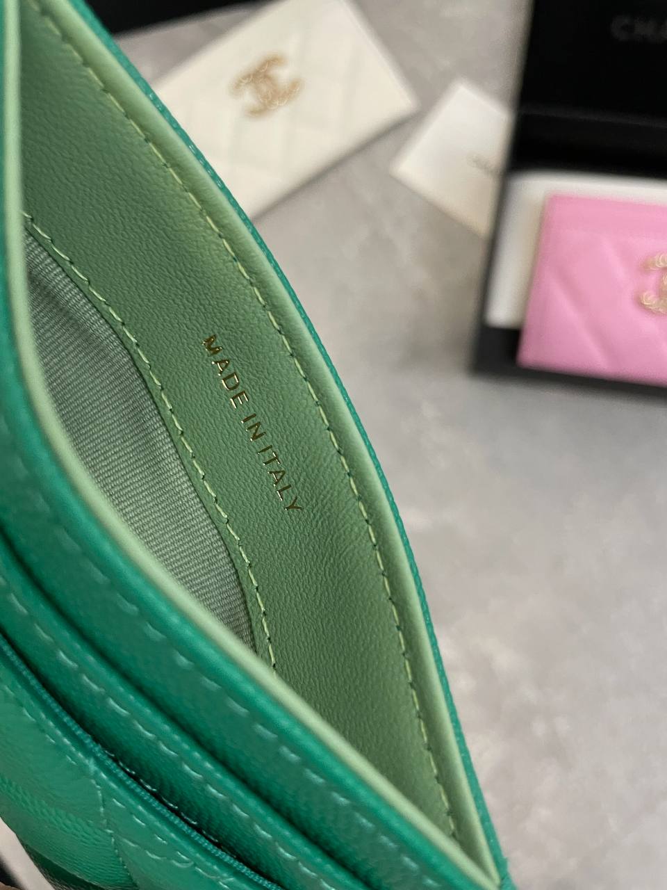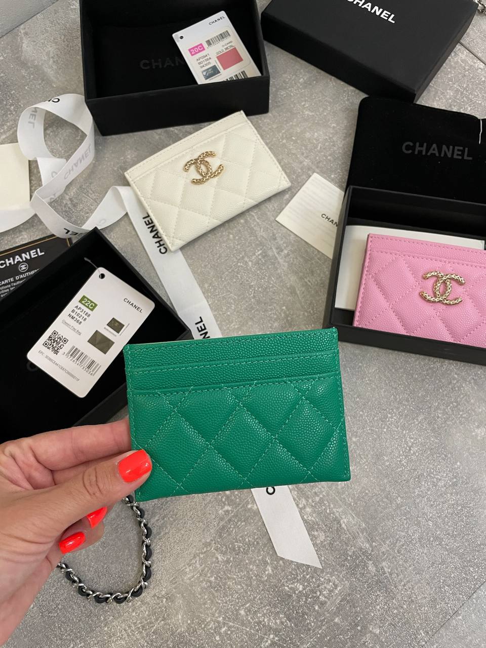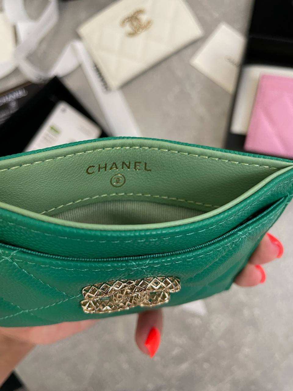 Визитница Chanel LUX-108818 - это элегантный аксессуар от известного модного дома. Зелёный цвет, ромбовидная стежка и золотистая фурнитура в виде логотипа создают узнаваемый стиль. Этот предмет идеально подходит для хранения визиток, карт и других необходимых мелочей.