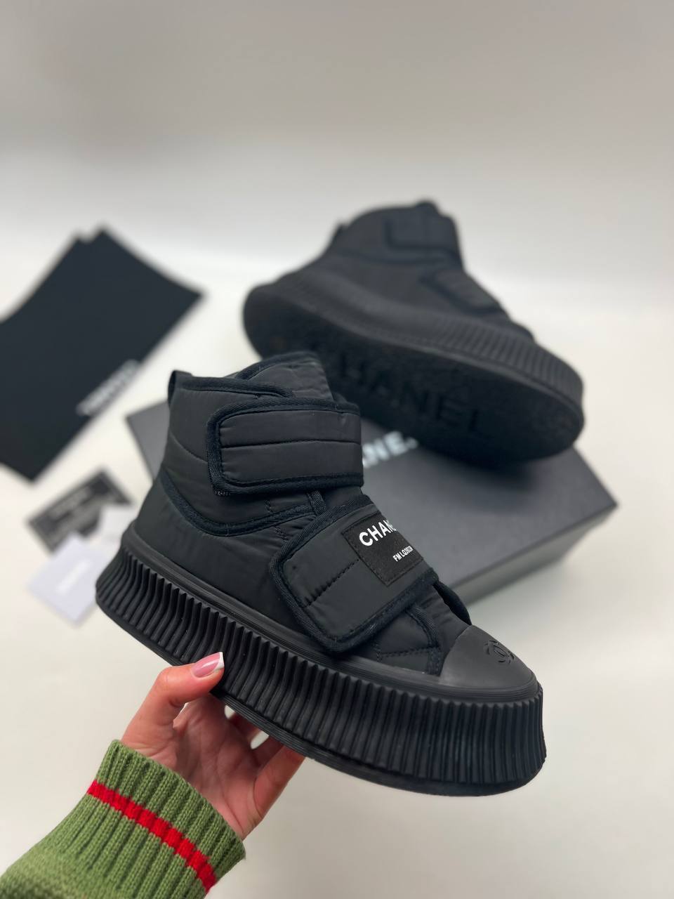 Высокие кеды из нейлона Chanel LUX-94936 - это стильная обувь, сочетающая в себе современный дизайн и практичность. Кеды выполнены в черном цвете, который придает им универсальность. Модель обладает необычной текстурой и высоким силуэтом, что делает их отличным выбором для создания модных образов.