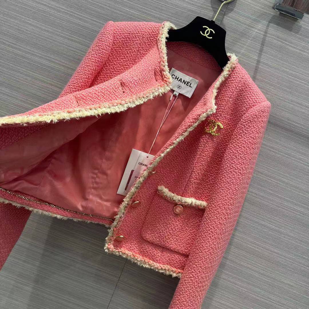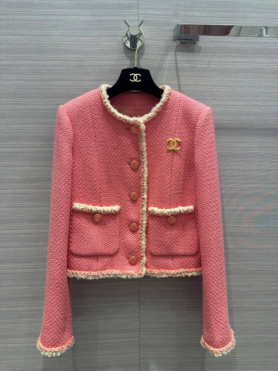 Жакет Chanel LUX-87820 - это воплощение элегантности и стиля, представленное в нежно-розовом цвете. Классический дизайн жакета с контрастной отделкой и золотистой фурнитурой создает утонченный образ. Идеально подходит для создания изысканных образов.