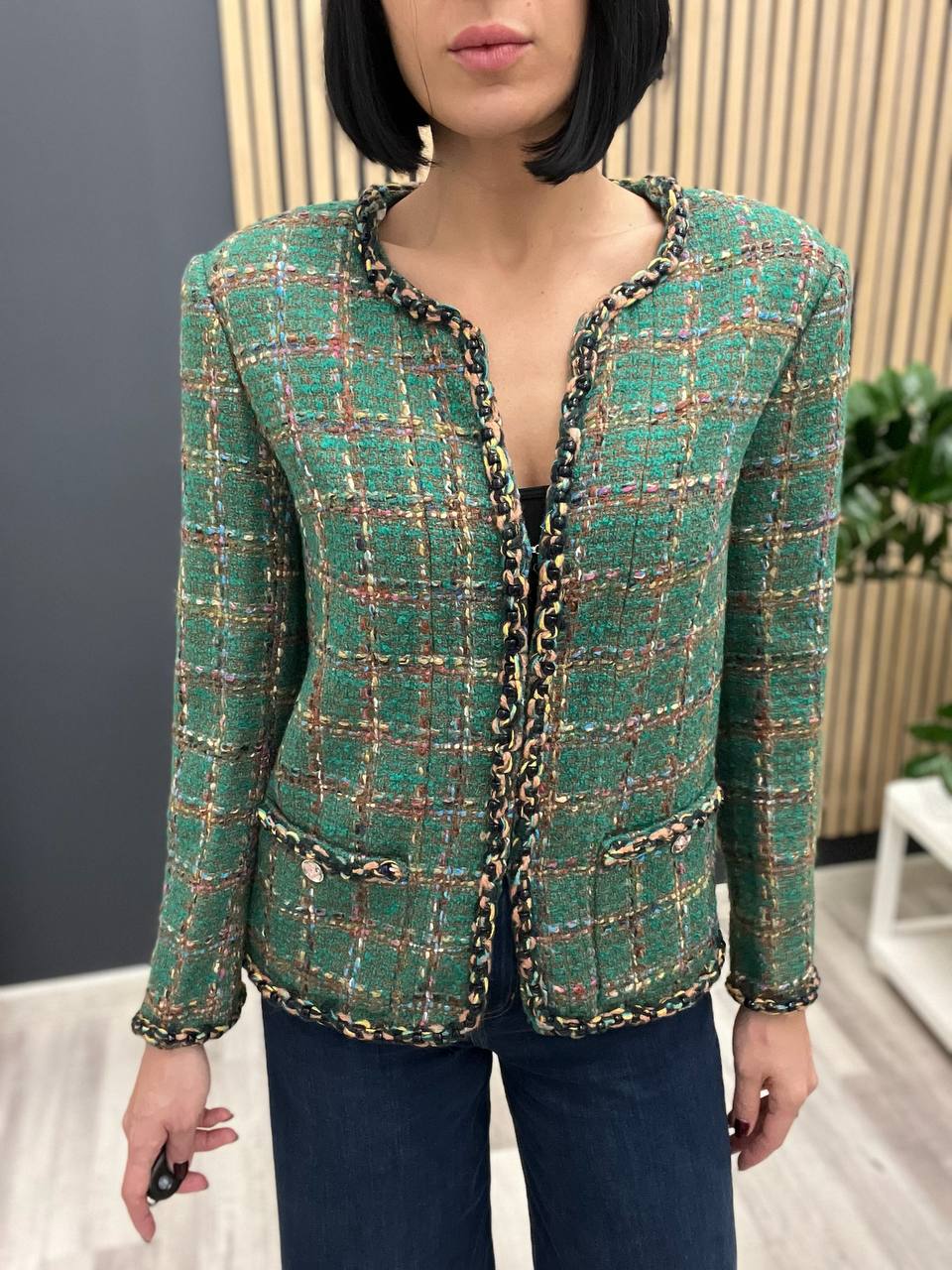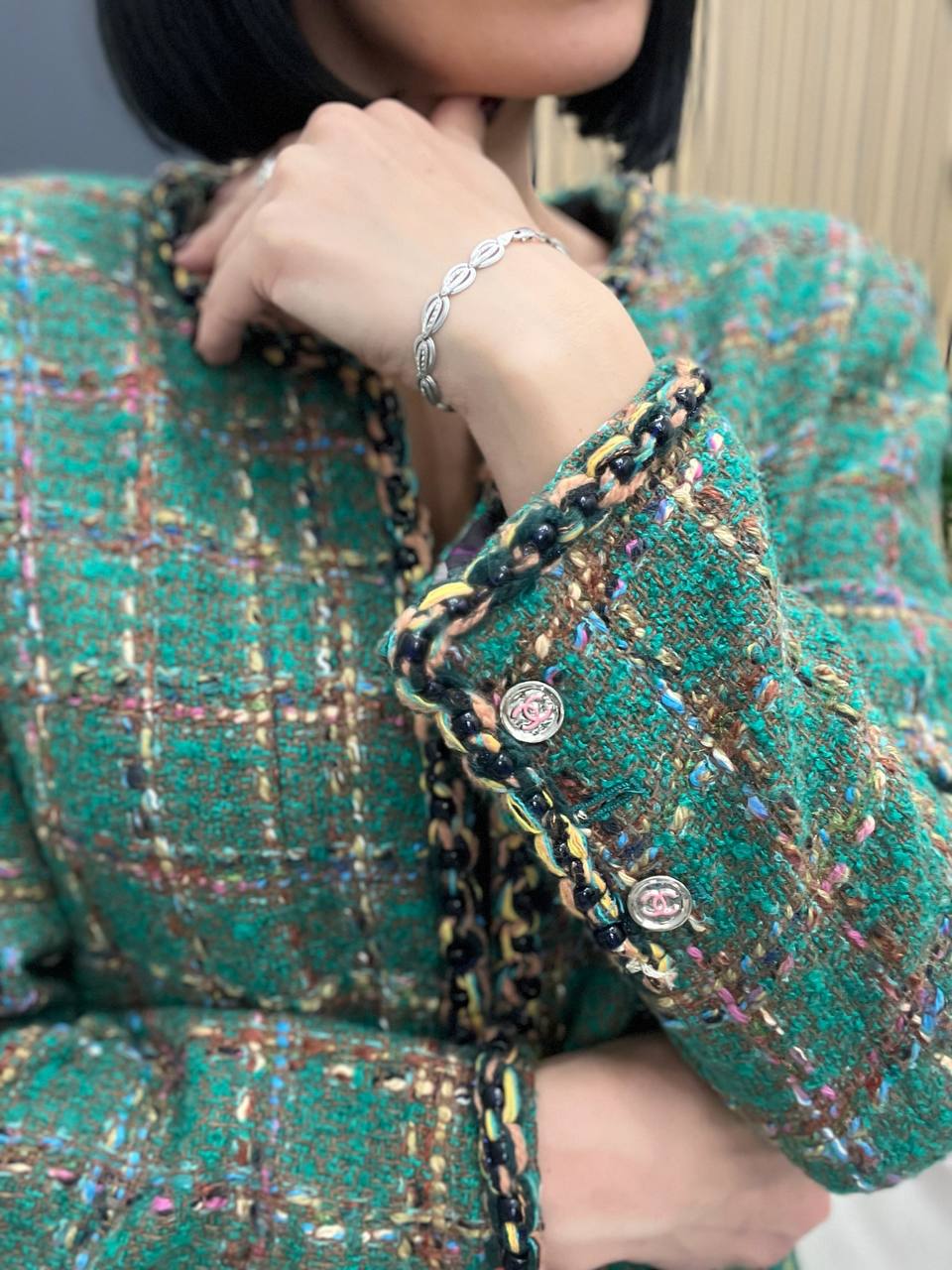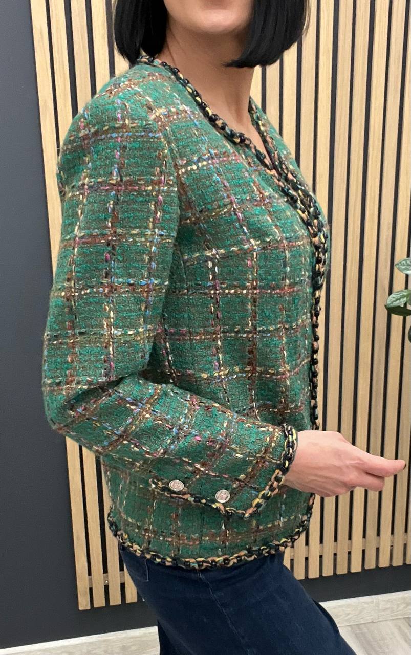 Жакет Chanel LUX-103000 – это элегантный предмет гардероба, который сочетает в себе стиль и комфорт. Зеленый жакет выполнен в классическом стиле, придавая образу изысканность. Он идеально подходит для создания как повседневных, так и более формальных образов.