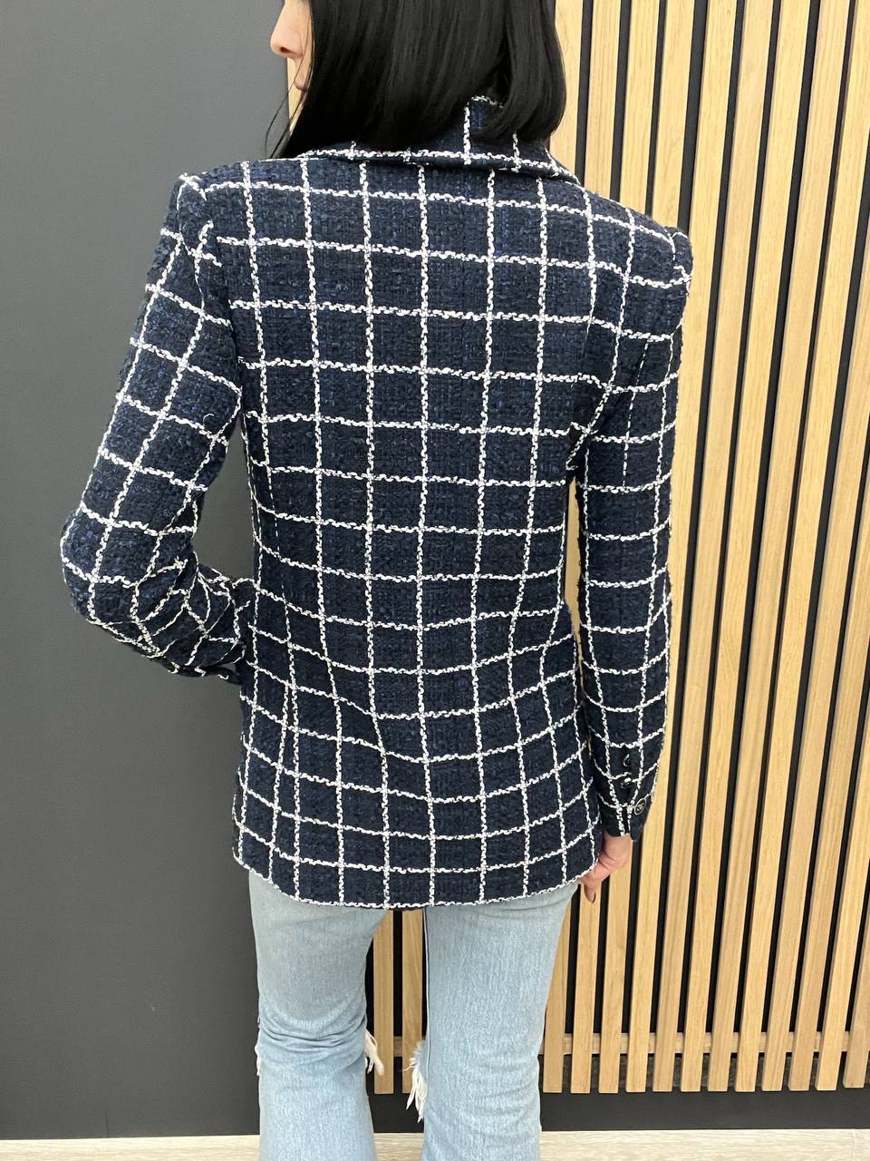 Жакет Chanel LUX-105522 – это воплощение элегантности и стиля. Жакет темно-синего цвета с белым диагональным узором идеально подойдет для создания как повседневных, так и более формальных образов. Текстура жакета выглядит изысканно и привлекательно.