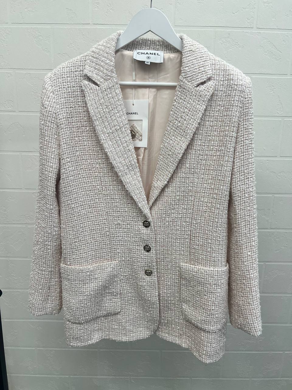 Жакет Chanel LUX-105674 представлен в классическом стиле, что делает его универсальным элементом гардероба. Жакет выполнен в нежно-розовом цвете с текстурированной тканью, которая добавляет изделию изысканности. Этот жакет подойдет для создания как повседневных, так и более формальных образов.