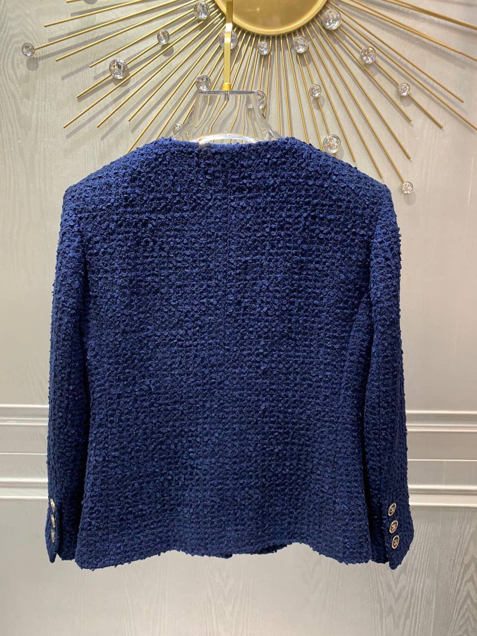 Жакет Chanel LUX-107626 — это элегантный предмет гардероба, который идеально подходит для создания утонченного образа. Жакет выполнен в темно-синем цвете с текстурированной тканью, имеет круглый вырез и застегивается на пуговицы с логотипом. Элегантные накладные карманы украшены фирменными деталями.