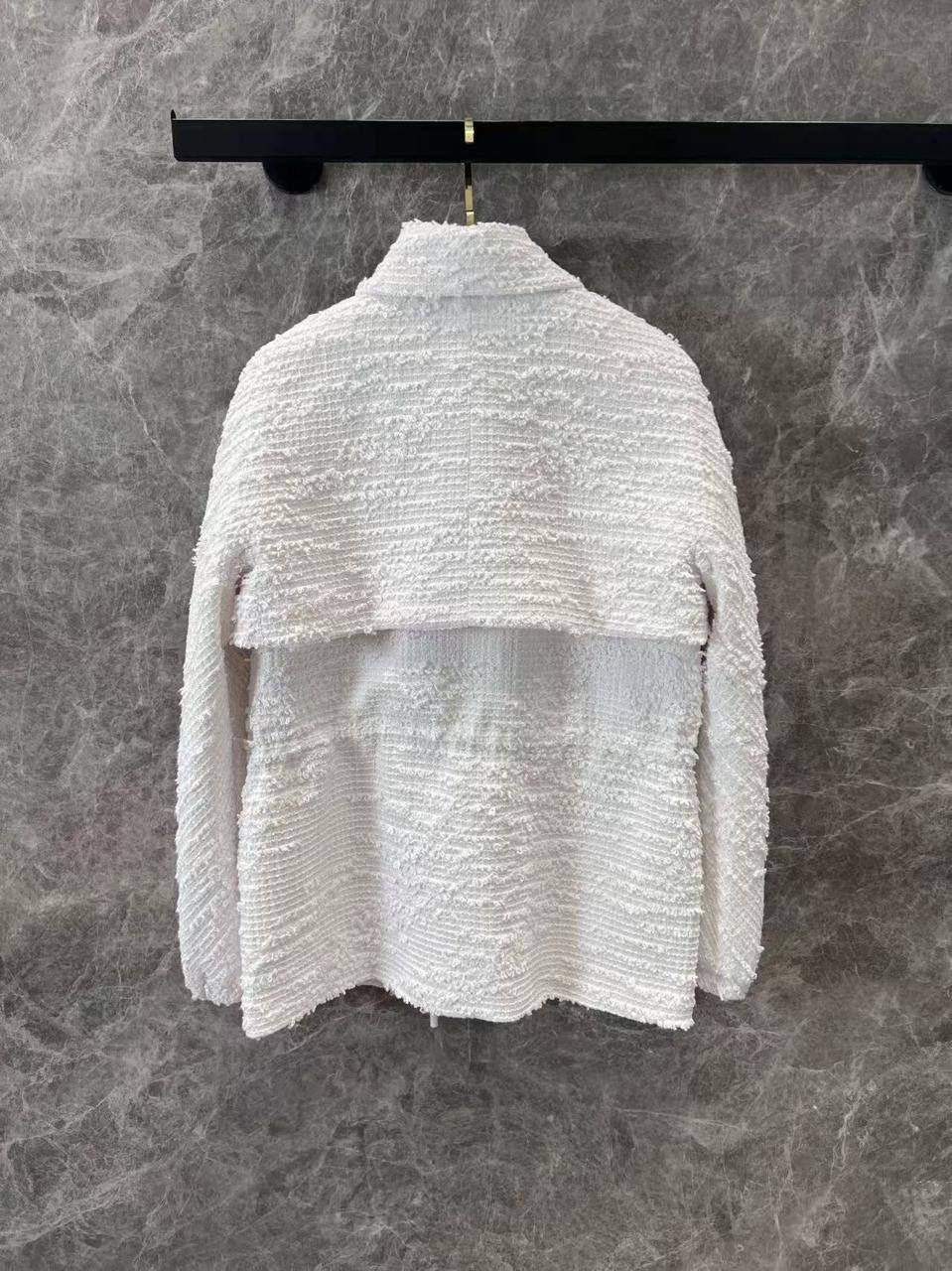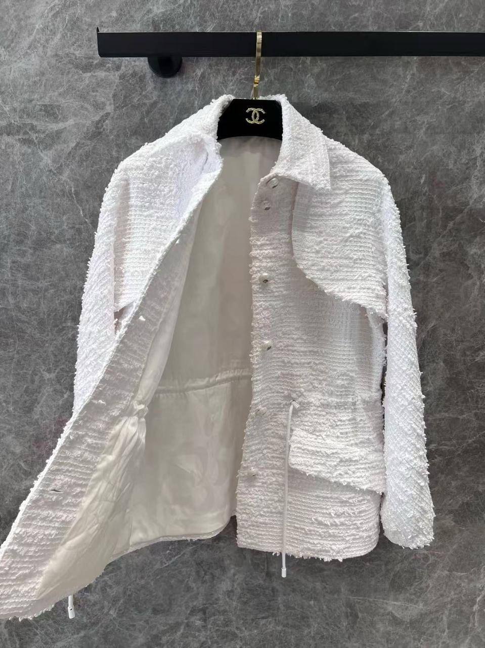 Жакет Chanel LUX-118889 - это воплощение элегантности и стиля от известного бренда. Жакет выполнен в классическом стиле, его белый цвет придает свежесть и легкость образу. Текстура ткани создает интересный визуальный эффект.