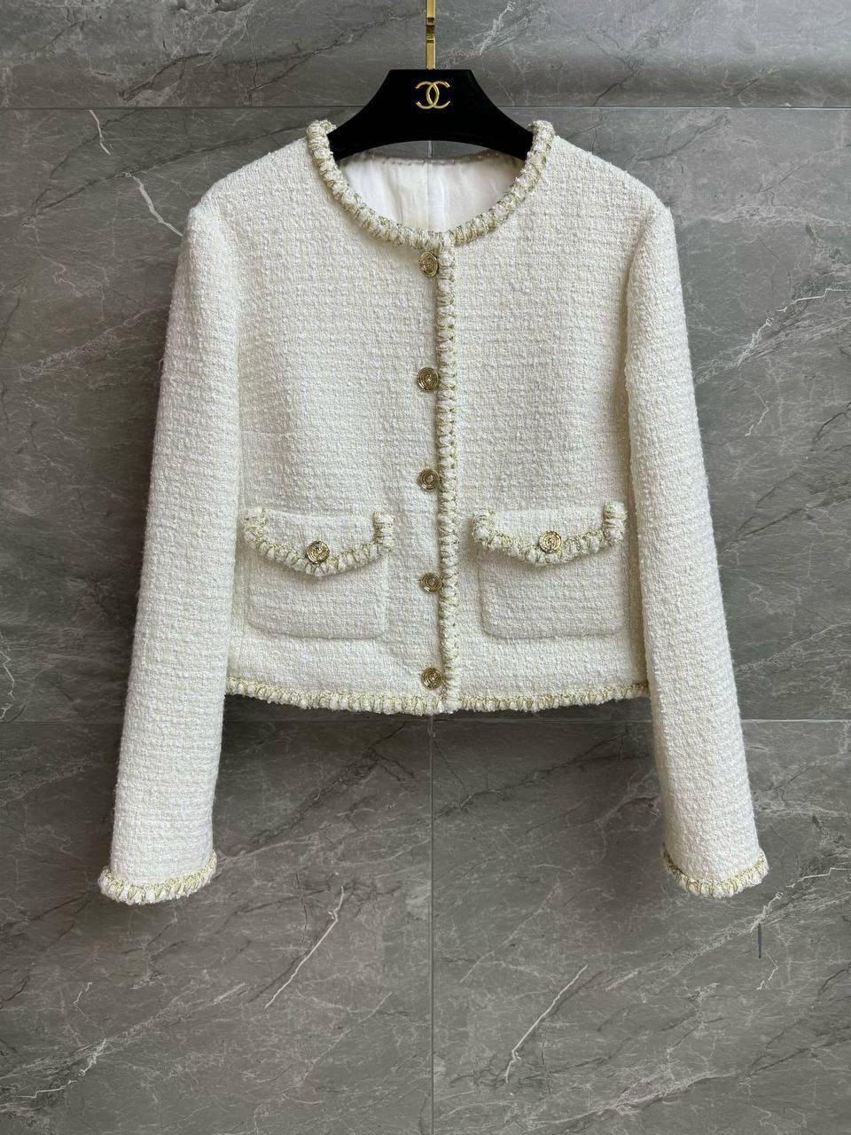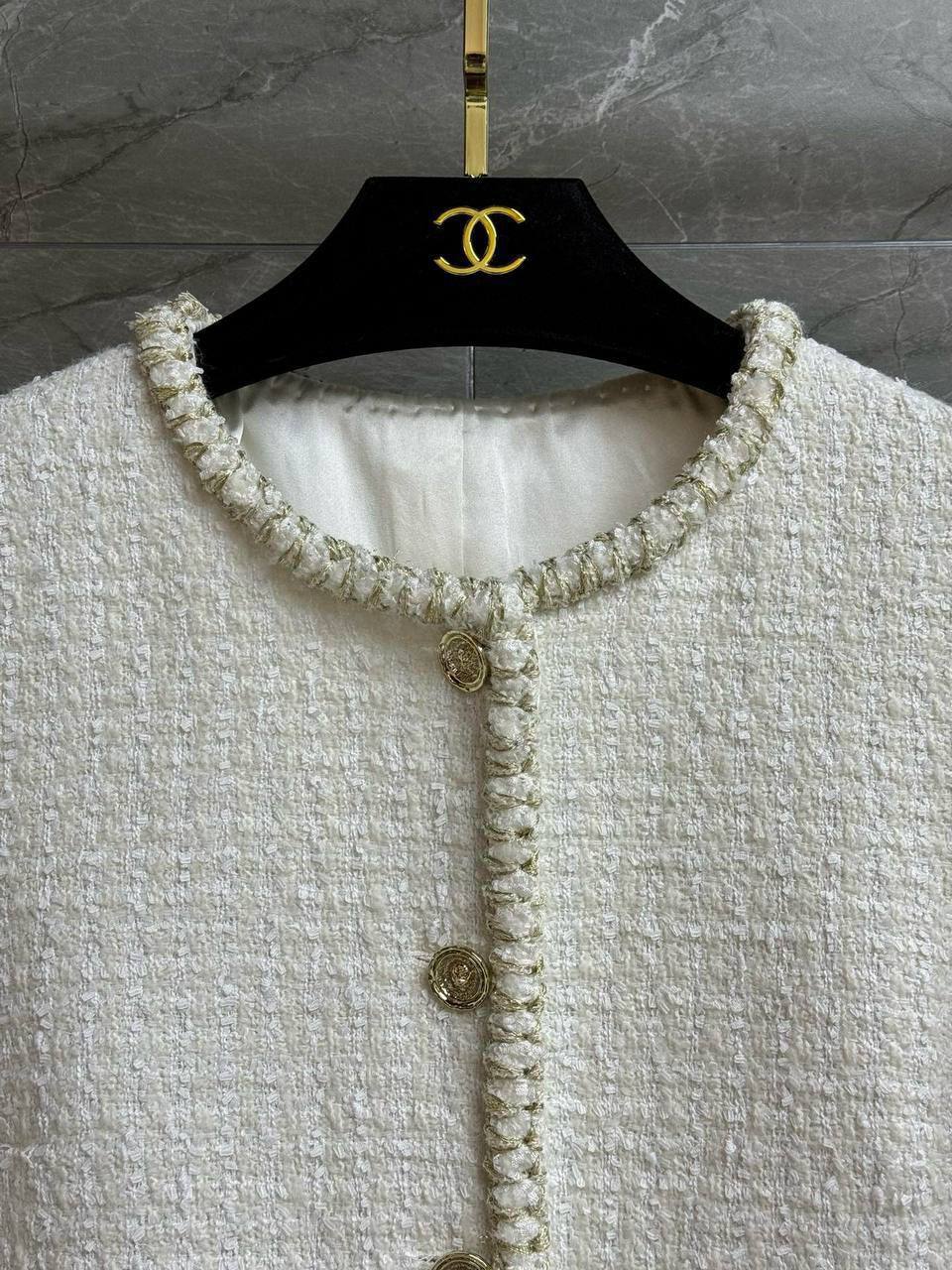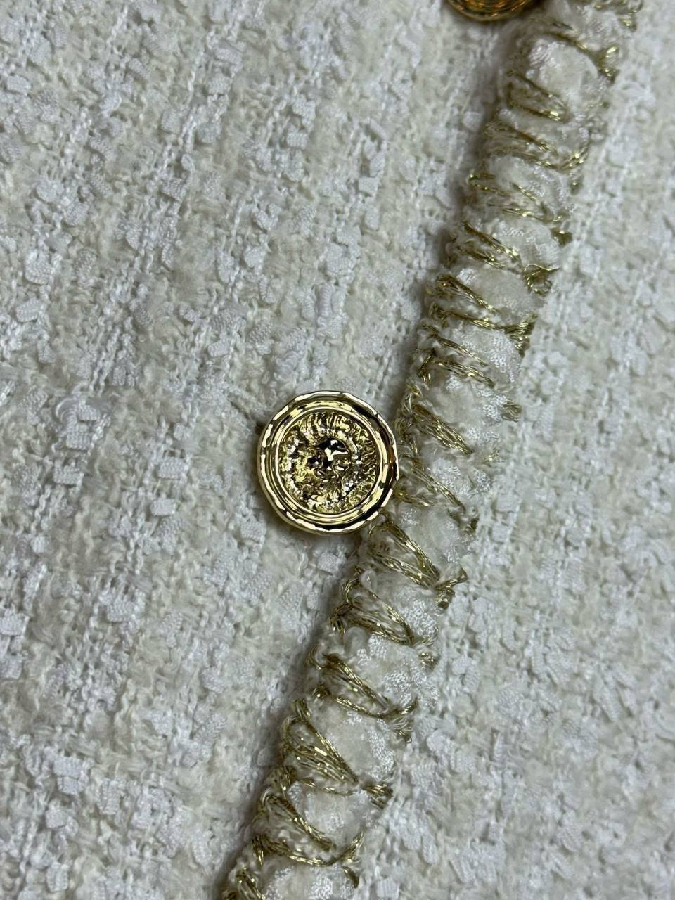 Стильный жакет Chanel, выполненный в актуальном дизайне. Его элегантный белый цвет и утонченные детали сделают его прекрасным дополнением к вашему гардеробу.