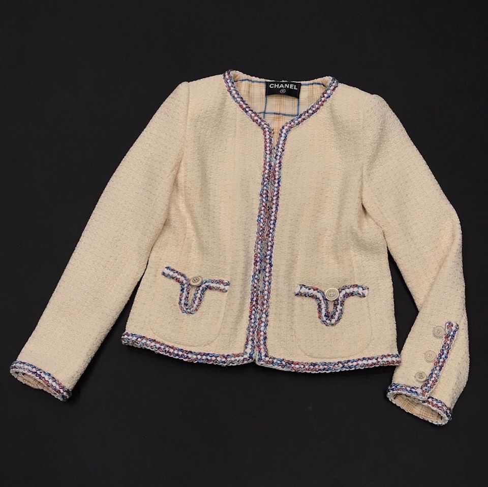 Этот элегантный жакет Chanel LUX-25485 представляет собой воплощение классической женственности и утонченного стиля. Жакет выполнен в кремовом оттенке, отделан контрастной разноцветной тесьмой по краям и на накладных карманах, что придает ему особый шарм. Отличный выбор для создания изысканных образов.
