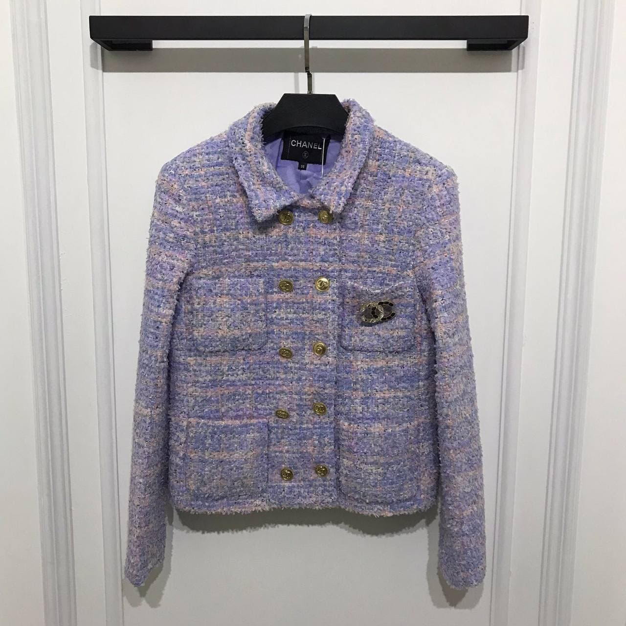 Представляем элегантный твидовый жакет Chanel LUX-59494, выполненный в нежном сиреневом оттенке с вкраплениями розовых и белых нитей. Эта модель, вдохновленная классическим стилем бренда, идеально подойдет для создания изысканных образов. Жакет украшен фирменной фурнитурой золотистого цвета и декоративной брошью.