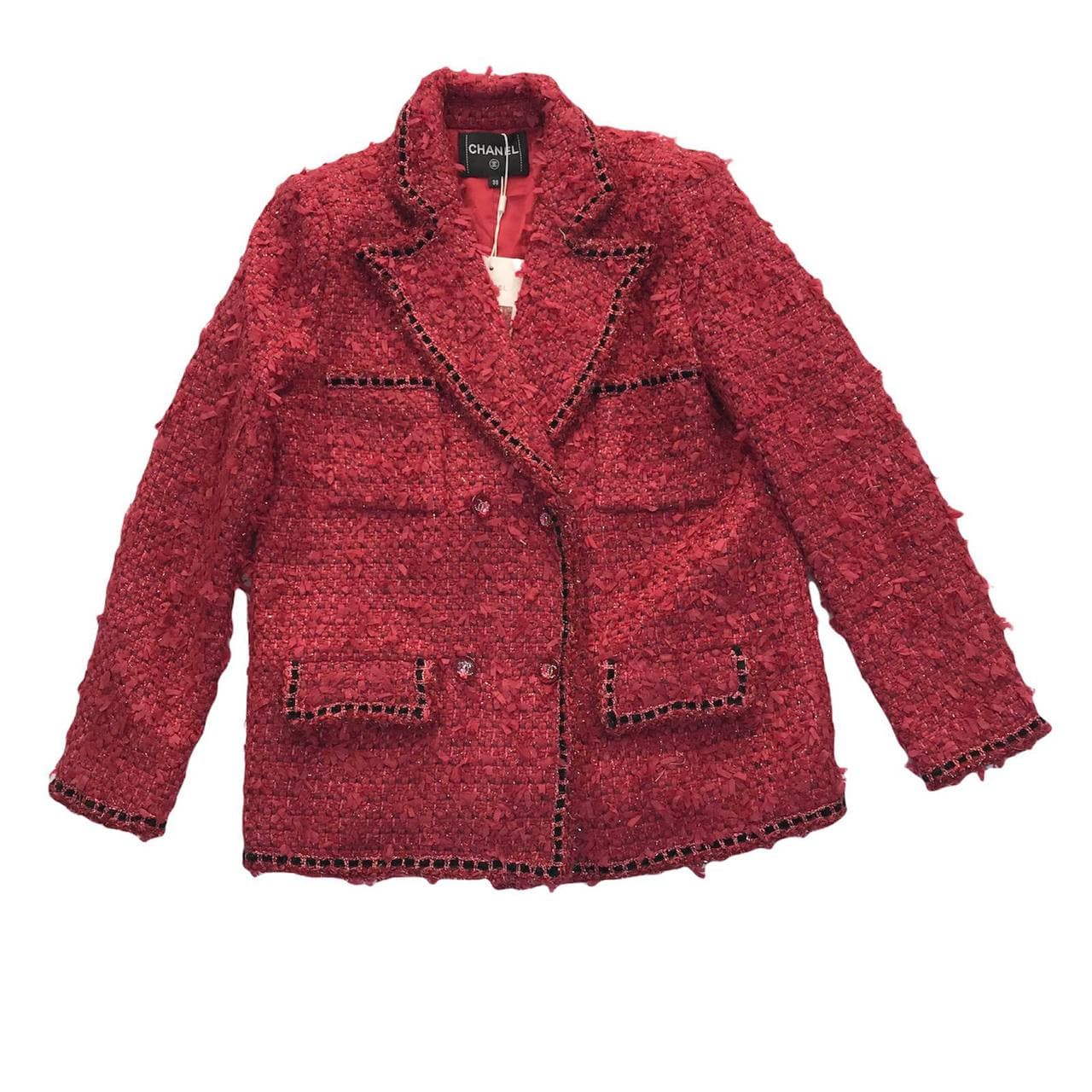 Этот женский жакет Chanel LUX-62364 является воплощением элегантности и классического стиля. Выполненный в насыщенном красном цвете, он украшен эффектной черной отделкой по краям, что придает ему изысканный вид. Классический крой с двумя рядами пуговиц и накладными карманами подчеркивает узнаваемый силуэт бренда.