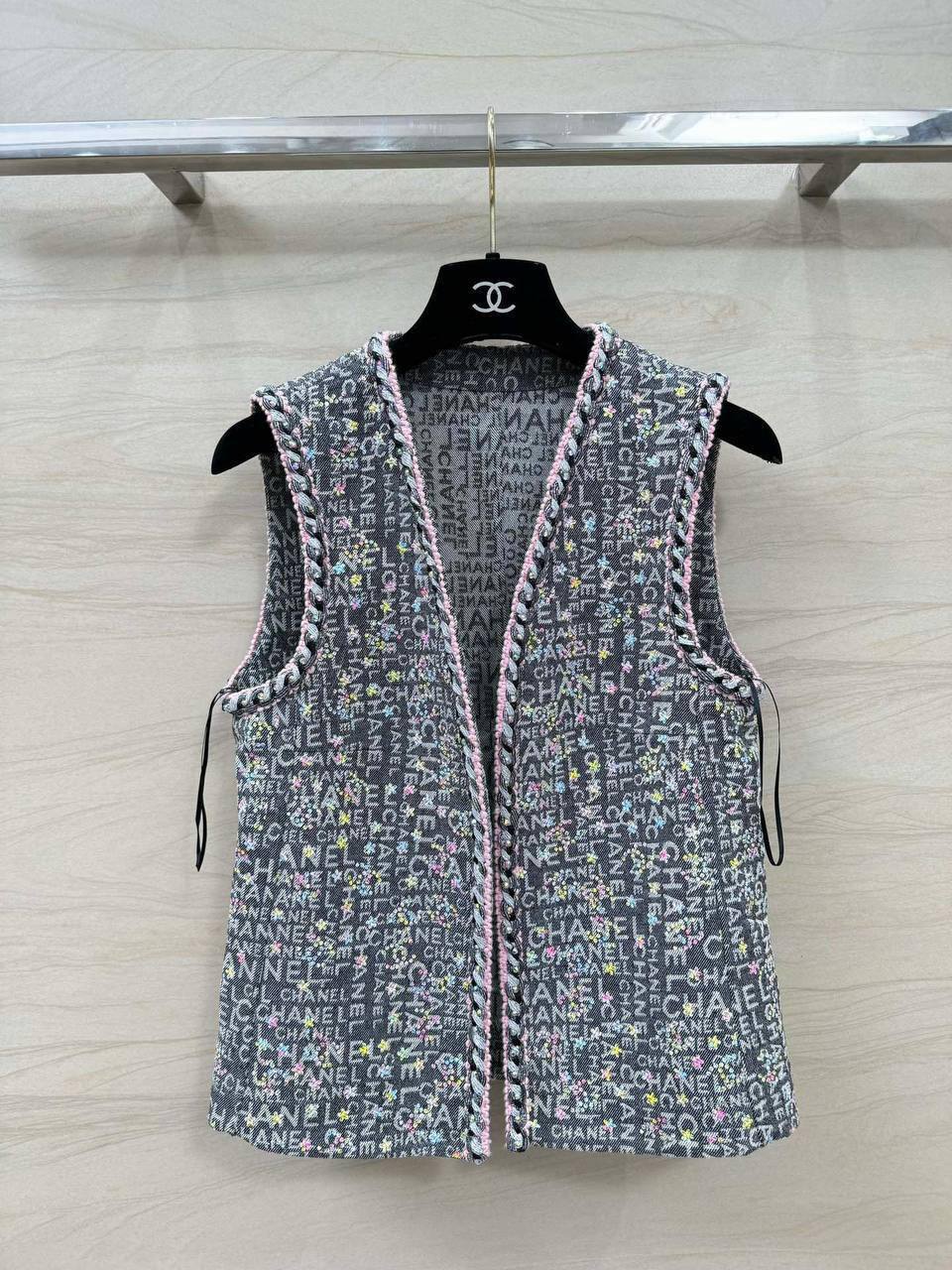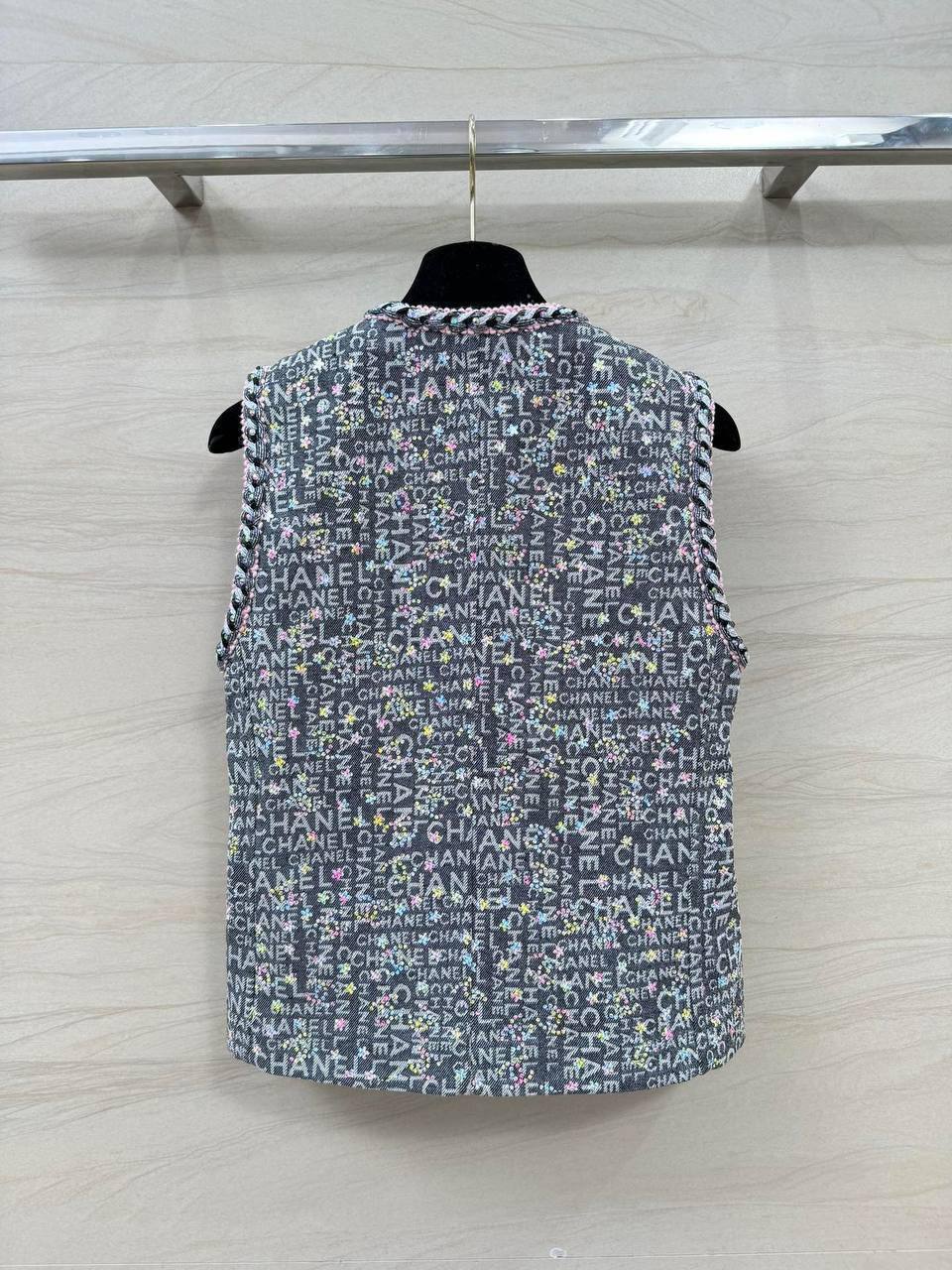 Жилет Chanel LUX-103422 – это элегантный предмет гардероба от известного дома моды. Жилет выполнен в графитовом оттенке с красочным принтом логотипов бренда. Его текстура, скорее всего, тканая, что создает приятные тактильные ощущения. Идеально подходит для создания многослойных образов.